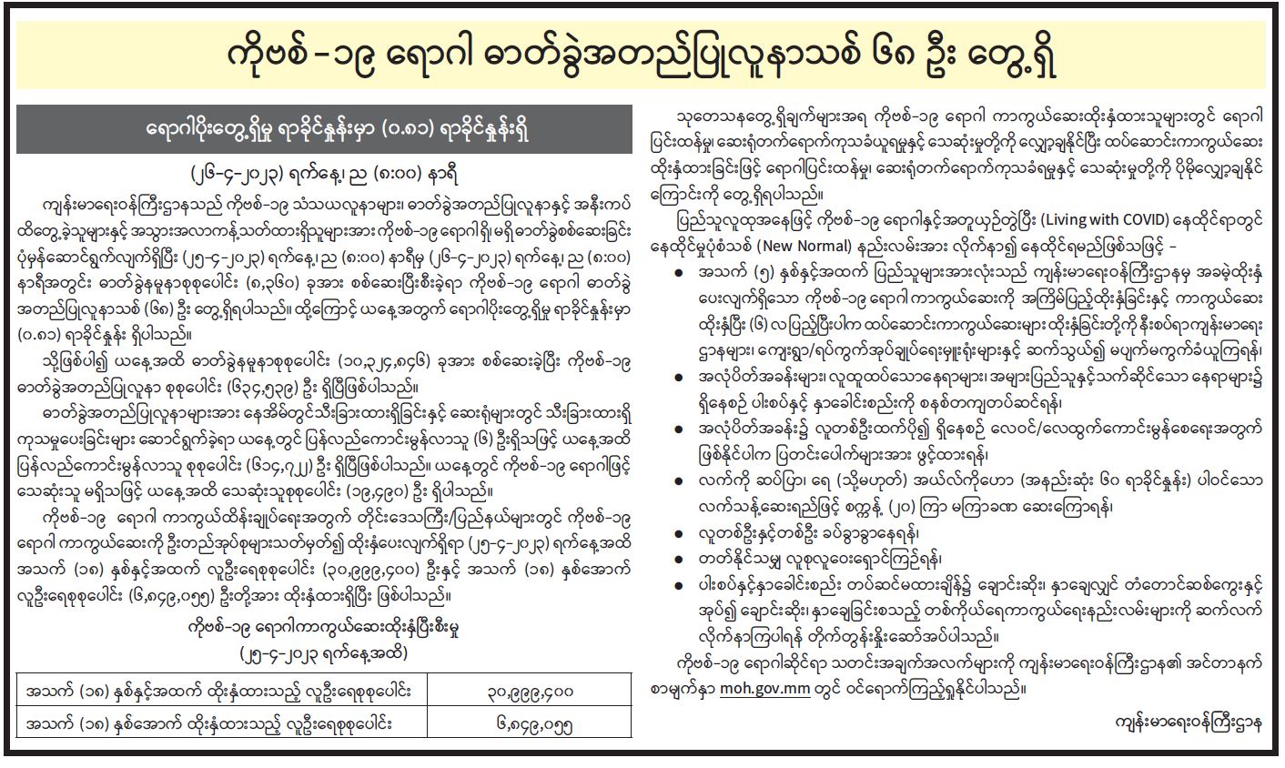 ကိုဗစ် - ၁၉ ရောဂါ ဓာတ်ခွဲအတည်ပြုလူနာသစ် ၆၈ ဦး တွေ့ရှိ