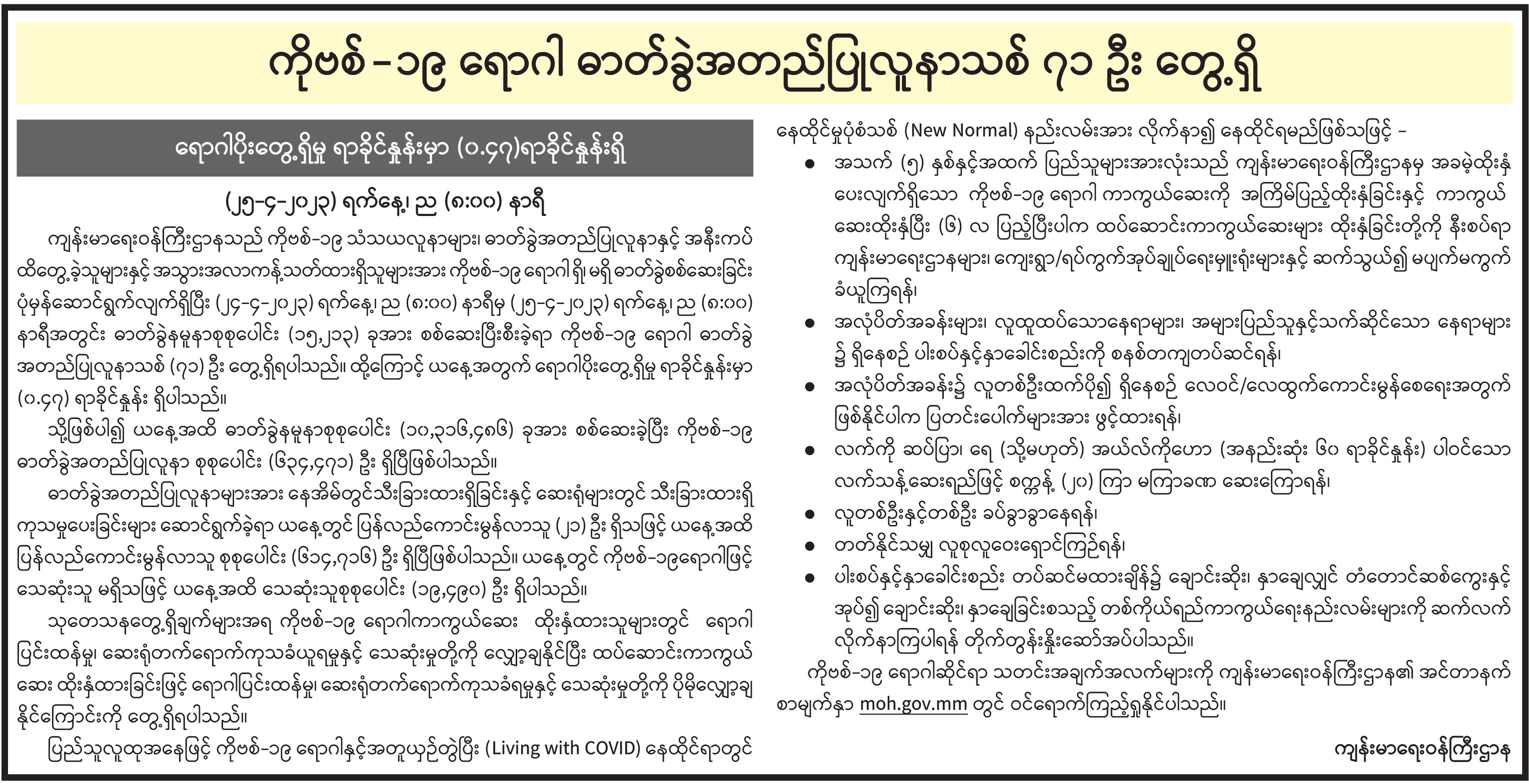 ကိုဗစ်-၁၉ ရောဂါ ဓာတ်ခွဲအတည်ပြုလူနာသစ် ၇၁ ဦး တွေ့ရှိ