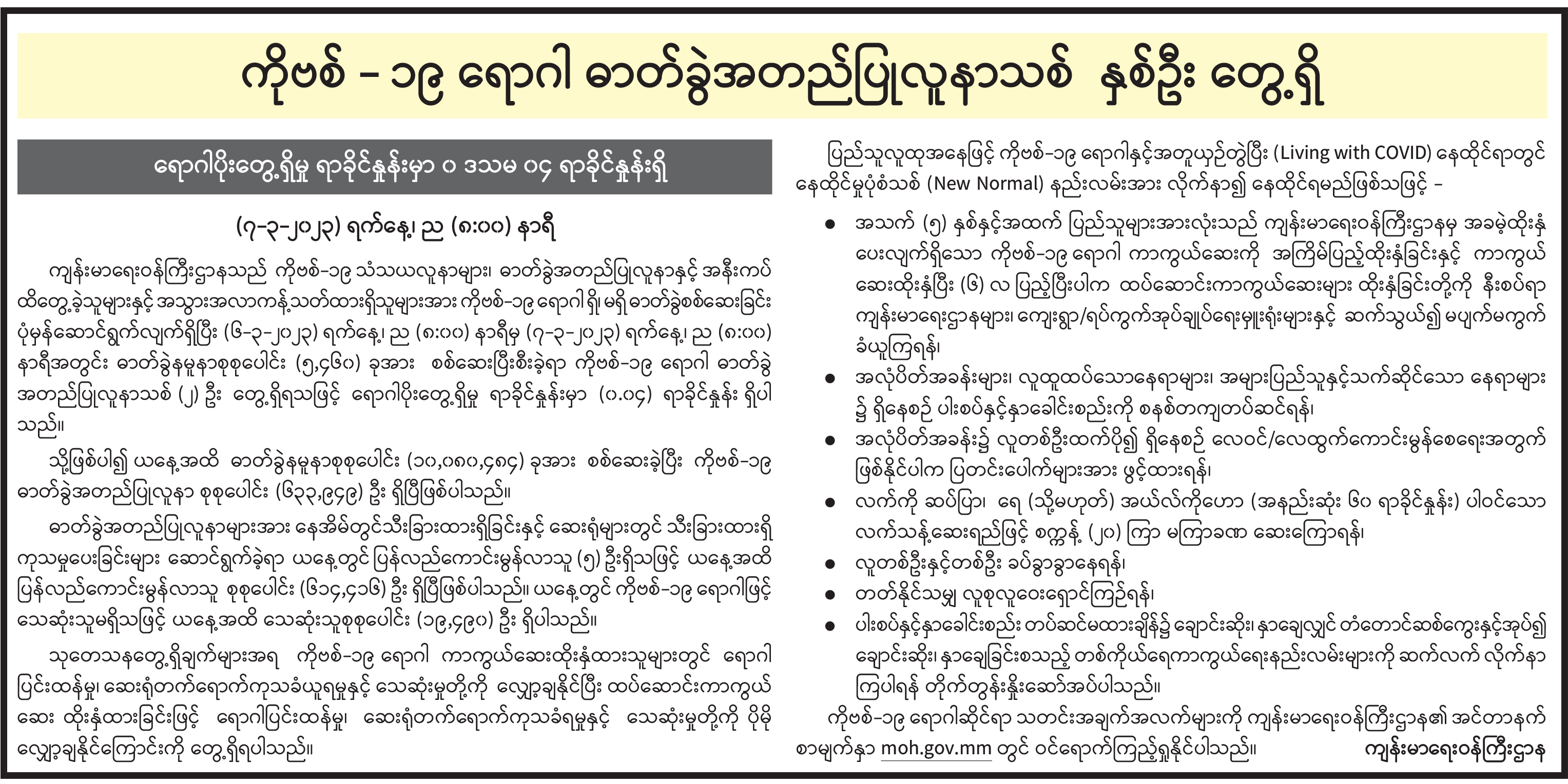 ကိုဗစ်-၁၉ ရောဂါ ဓာတ်ခွဲအတည်ပြုလူနာသစ် နှစ်ဦး တွေ့ရှိ