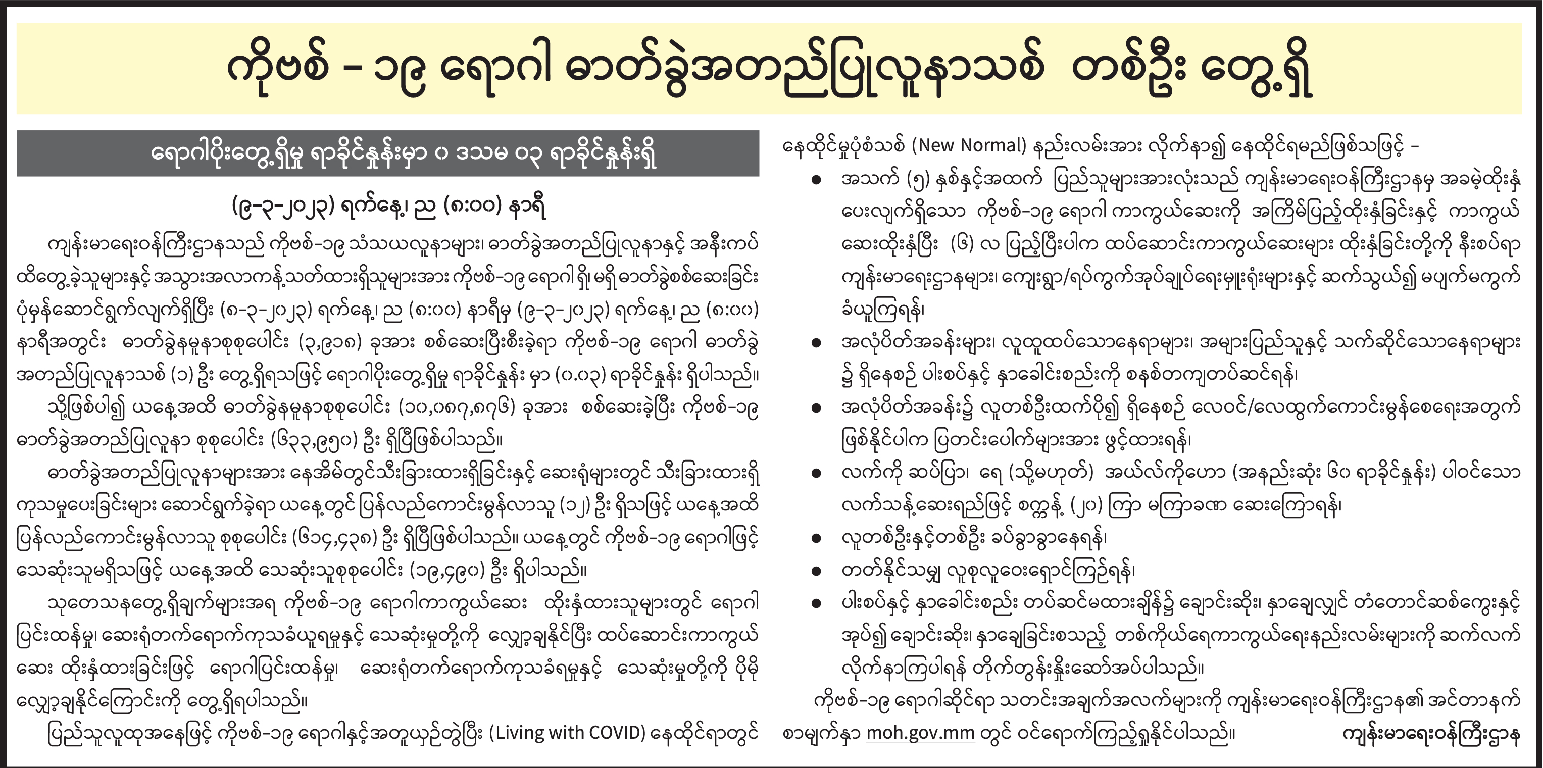 ကိုဗစ်-၁၉ ရောဂါ ဓာတ်ခွဲအတည်ပြုလူနာသစ် တစ်ဦး တွေ့ရှိ