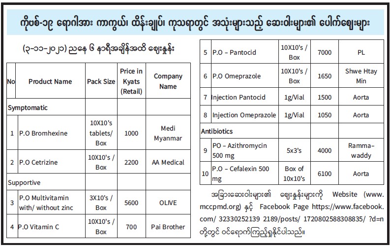 ကိုဗစ်-၁၉ ရောဂါ ကာကွယ်၊ ထိန်းချုပ်၊ ကုသရာတွင် အသုံးများသည့် ဆေးဝါးများ၏ ပေါက်ဈေးများ