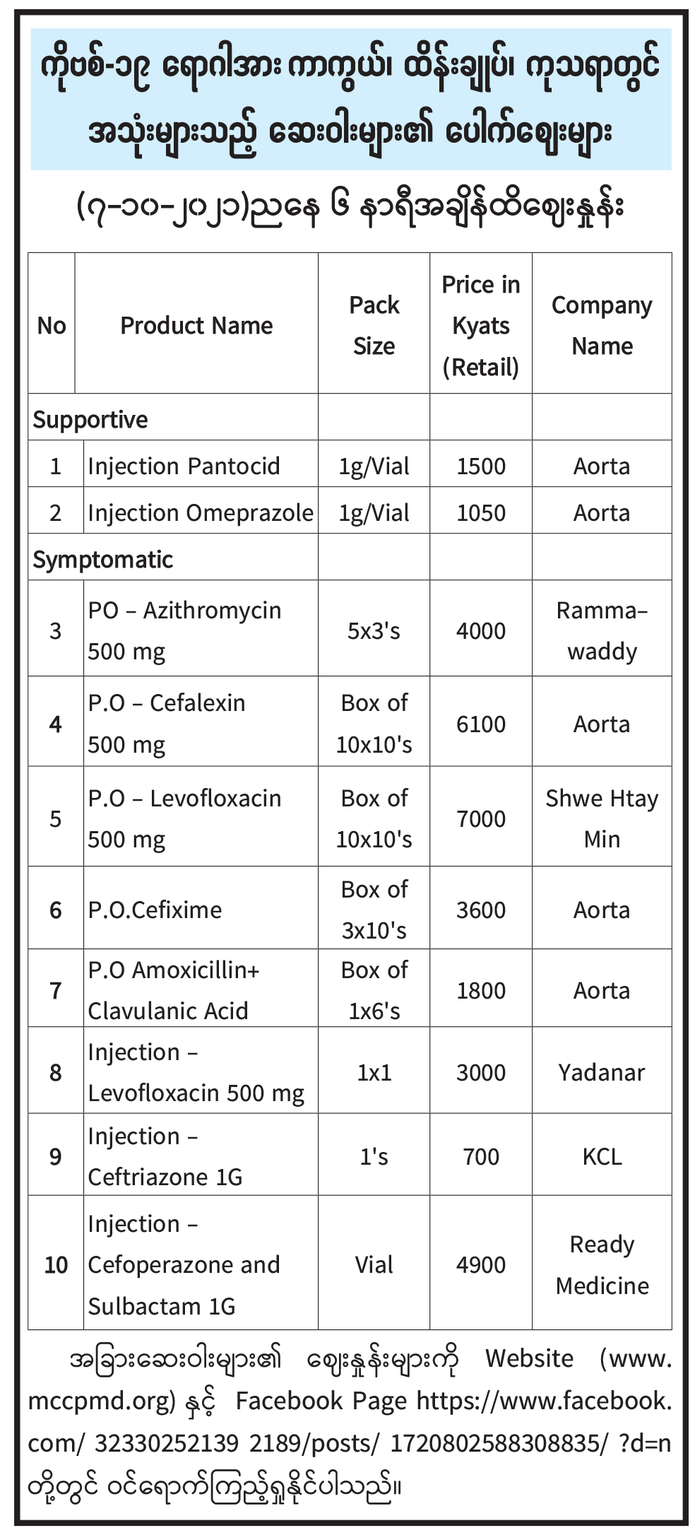 ကိုဗစ် - ၁၉ ရောဂါအား ကာကွယ်၊ ထန်းချုပ်၊ ကုသရာတွင် အသုံးများသည့် ဆေးဝါးများ၏ ပေါက်ဈေးများ