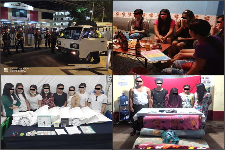 ကိုဗစ်-၁၉ ရောဂါကူးစက်နိုင်မှု ဖြစ်နိုင်ခြေအများဆုံး အခြေအနေရှိပြီး သတ်မှတ် စည်းကမ်းချက်များအား လိုက်နာခြင်းမရှိသည့် KTV/ Bar/ အနှိပ်ခန်းများ ဖွင့်လှစ်နေမှုကို ထိရောက်စွာ ထိန်းချုပ်နိုင်ရေးနှင့် ညမထွက်ရ အချိန်ကျော်လွန် သွားလာနေမှုများကို ဆက်လက် စိစစ်ဖော်ထုတ် အရေးယူဆောင်ရွက်မှုများ ပြုလုပ်လျှက်ရှိပြီး မြို့နယ်/ရပ်ကွက် များအတွင်း စည်းကမ်းလိုက်နာမှုမရှိသည့် လုပ်ရပ်များကို ဆောင်ရွက်နေခြင်းအား သတင်း ဖော်ထုတ်မှု၊ စိစစ်ကြပ်မတ်မှု အလေးထားဆောင်ရွက်ရန် နယ်မြေတာဝန်ခံ ရဲတပ်ဖွဲ့ဝင်များ ကို တွန်းအားပေးဆောင်ရွက်လျက်ရှိကြောင်း မြန်မာနိုင်ငံ ရဲတပ်ဖွဲ့မှ သိရသည်။