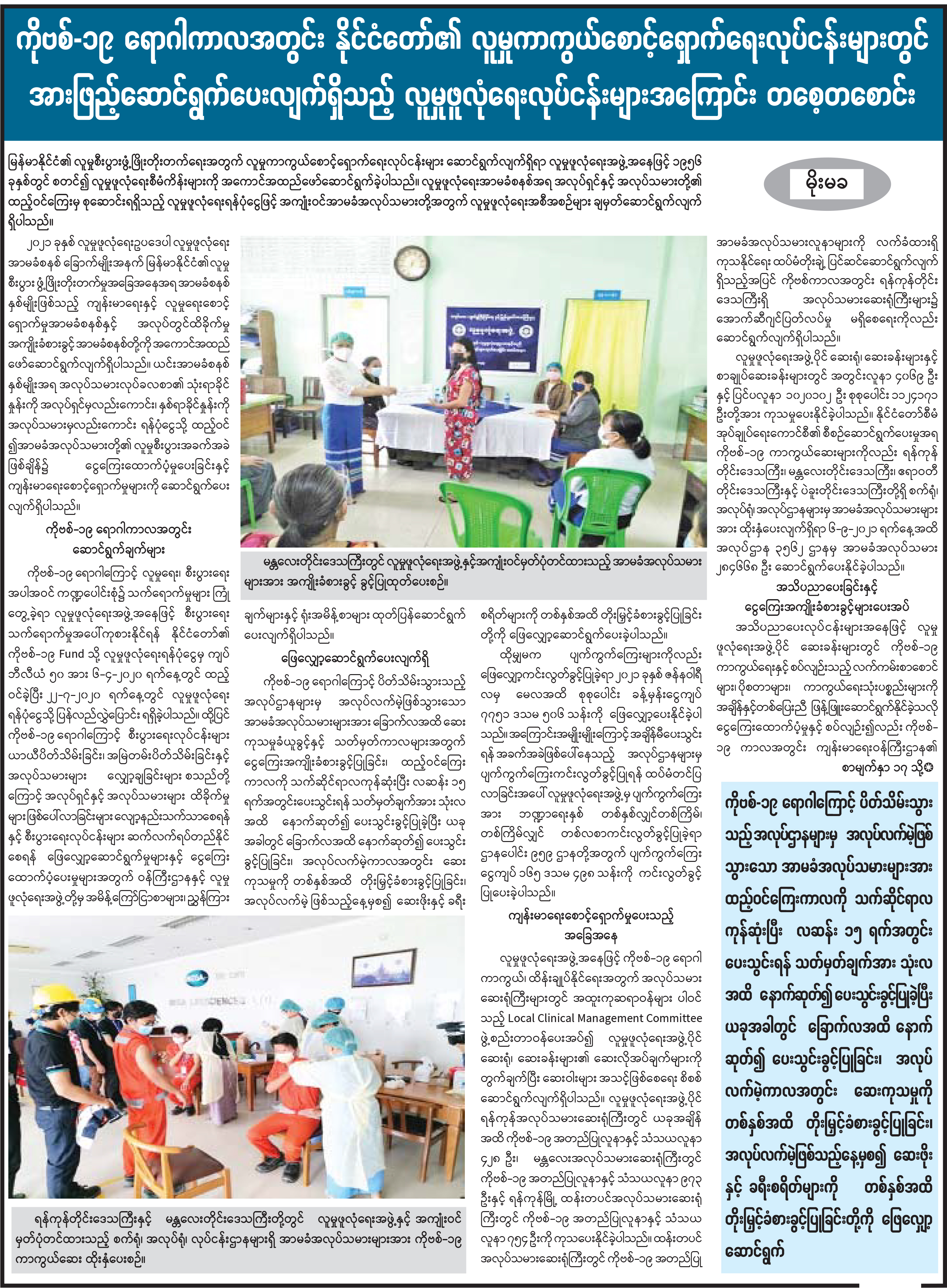 ကိုဗစ်-၁၉ ရောဂါကာလအတွင်း နိုင်ငံတော်၏ လူမှုကာကွယ်စောင့်ရှောက်ရေးလုပ်ငန်းများတွင် အားဖြည့်ဆောင်ရွက်ပေးလျက်ရှိသည့် လူမှုဖူလုံရေးလုပ်ငန်းများအကြောင်း တစေ့တစောင်း