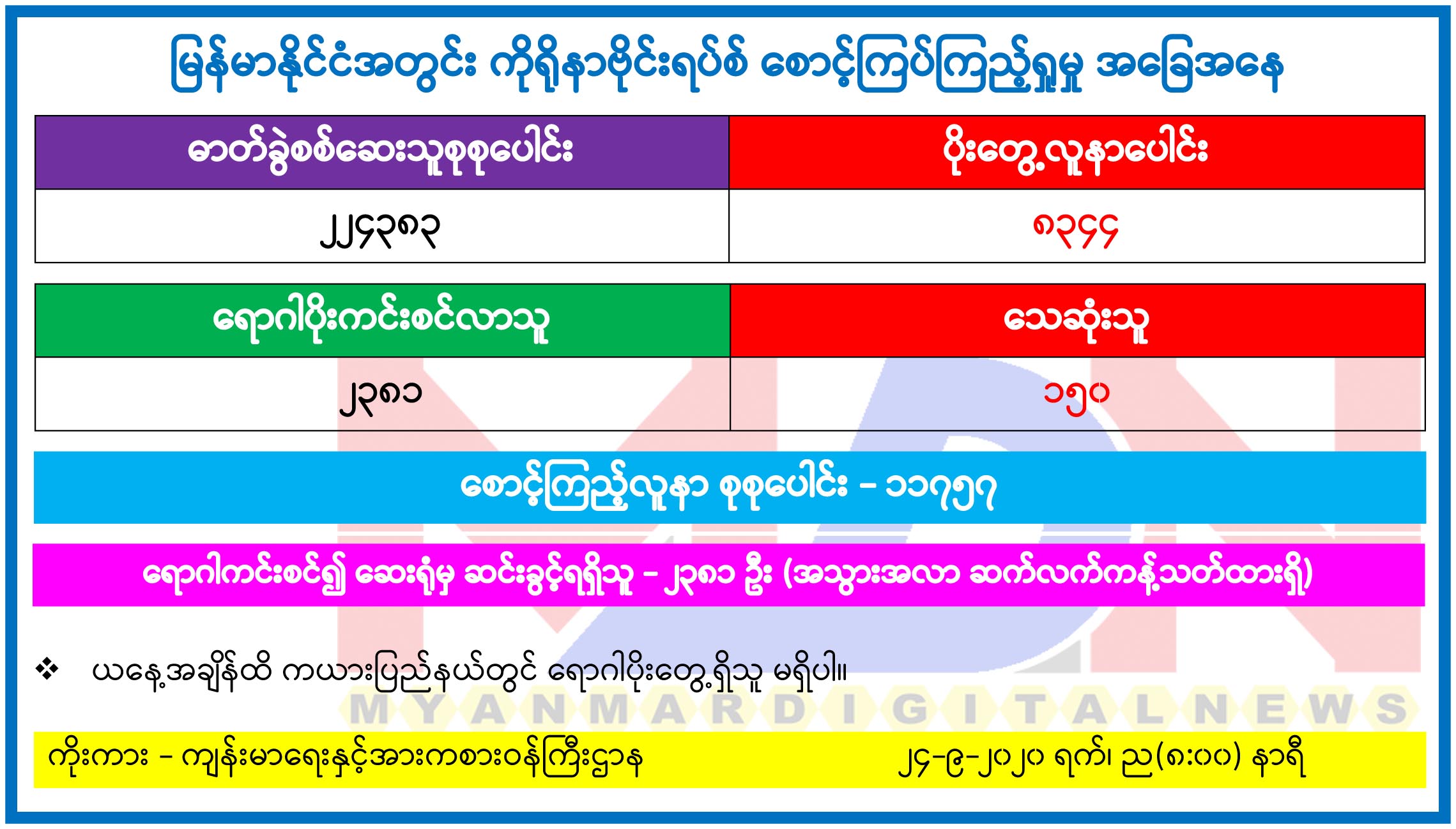 ယနေ့တွင် ကိုဗစ်-၁၉ ရောဂါပိုးရှိသူ ၁၀၅၂ ဦး ထပ်မံတွေ့ရှိသဖြင့် ယနေ့အထိ ရောဂါပိုးရှိသူ စုစုပေါင်း ၈၃၄၄ ဦး ရှိသွားပြီဖြစ်ကြောင်း၊ ရောဂါပိုးတွေ့ရှိသူ ၈၃၄၄ ဦးအနက် သေဆုံးသူ ၁၅၀၊ ဆေးရုံမှ ဆင်းခွင့်ပြုခဲ့သူ ၂၃၈၁ ဦးနှင့် စက်တင်ဘာ ၂၃ ရက် မွန်းတည့် ၁၂ နာရီမှ စက်တင်ဘာ ၂၄ ရက် မွန်းတည့် ၁၂ နာရီအတွင်း စောင့်ကြည့်လူနာအသစ် ၄၁၆ ဦးရှိကြောင်း ကျန်းမာရေးနှင့် အားကစားဝန်ကြီးဌာန၏ ယနေ့ထုတ်ပြန်ချက်များအရ သတင်းရရှိသည်။