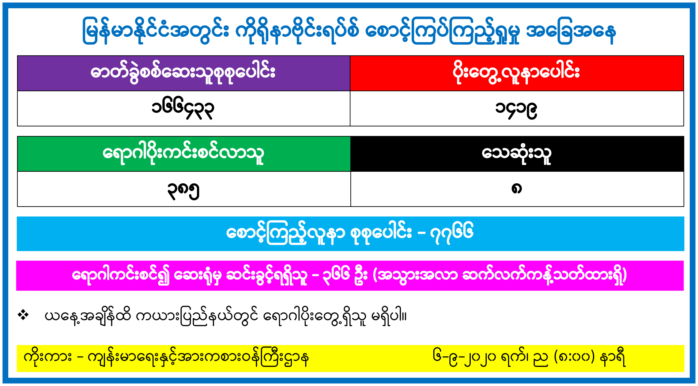 ယနေ့တွင် ကိုဗစ်-၁၉ ရောဂါပိုးရှိသူ ၁၆၆ ဦးထပ်မံတွေ့ရှိသဖြင့် ယနေ့အထိ ရောဂါပိုးရှိသူ စုစုပေါင်း ၁၄၁၉ ဦးရှိသွားပြီဖြစ်ကြောင်း၊ ရောဂါပိုးတွေ့ရှိသူ ၁၄၁၉ ဦးအနက် သေဆုံးသူ ရှစ်ဦး၊ ပိုးမတွေ့ရှိတော့သူ ၃၈၅ ဦး၊ ဆေးရုံမှဆင်းခွင့်ပြုခဲ့သူ ၃၆၆ ဦးနှင့် စက်တင်ဘာ ၅ ရက် မွန်းတည့် ၁၂ နာရီမှ စက်တင်ဘာ ၆ ရက် မွန်းတည့် ၁၂ နာရီအတွင်း စောင့်ကြည့်လူနာအသစ် ၁၄၂ ဦးရှိကြောင်း ကျန်းမာရေးနှင့် အားကစားဝန်ကြီးဌာန၏ ယနေ့ ထုတ်ပြန်ချက်များအရ သတင်းရရှိသည်။