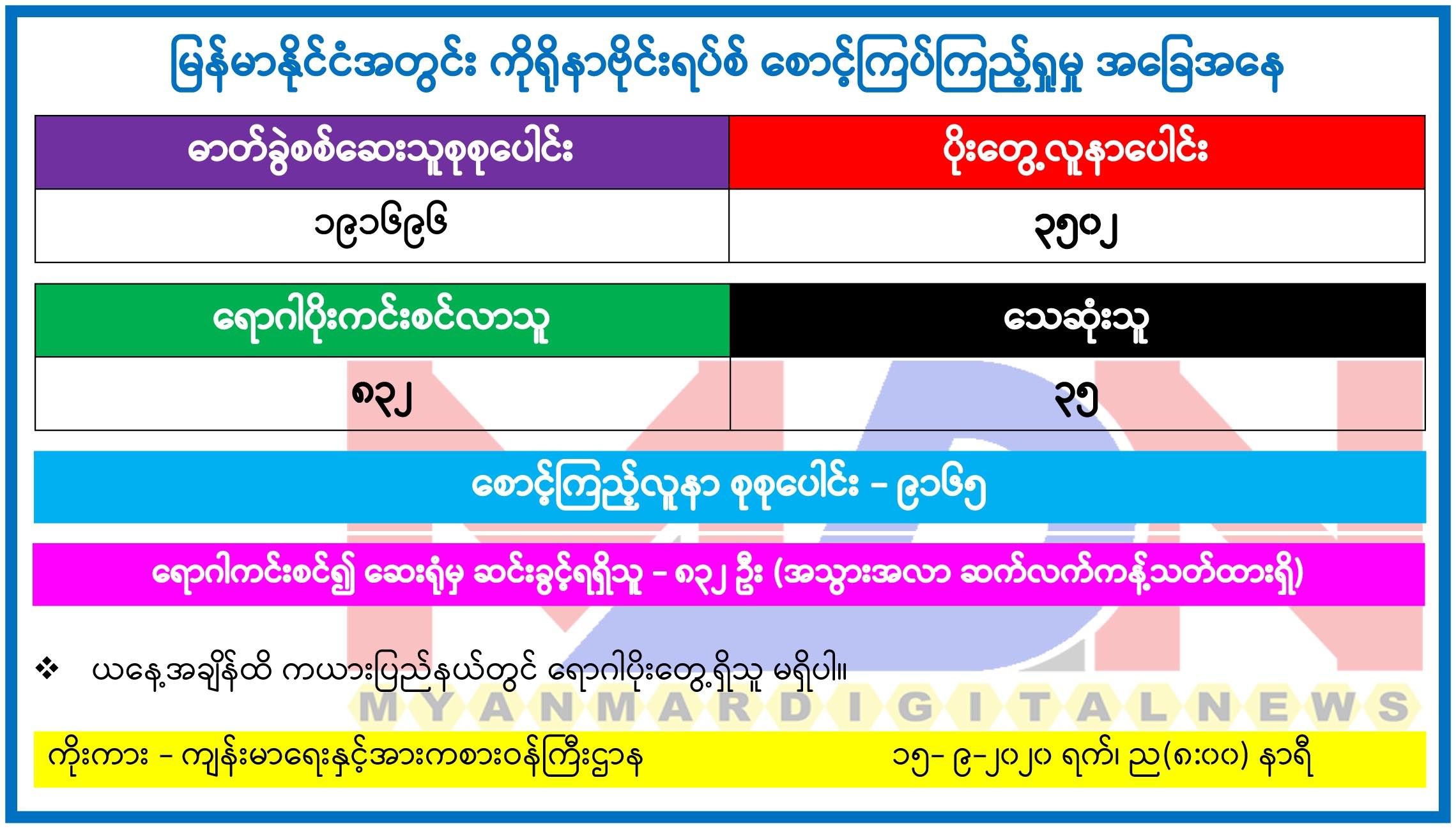ယနေ့တွင် ကိုဗစ်-၁၉ ရောဂါပိုးရှိသူ ၃၀၇ ဦး ထပ်မံတွေ့ရှိသဖြင့် ယနေ့အထိ ရောဂါပိုးရှိသူ စုစုပေါင်း ၃၅၀၂ ဦး ရှိသွားပြီဖြစ်ကြောင်း၊ ရောဂါပိုးတွေ့ရှိသူ ၃၅၀၂ ဦးအနက် သေဆုံးသူ ၃၅ ဦး၊ ဆေးရုံမှဆင်းခွင့်ပြုခဲ့သူ ၈၃၂ ဦးနှင့် စက်တင်ဘာ ၁၄ ရက် မွန်းတည့် ၁၂ နာရီမှ စက်တင်ဘာ ၁၅ ရက် မွန်းတည့် ၁၂ နာရီအတွင်း စောင့်ကြည့်လူနာအသစ် ၂၅၇ ဦးရှိကြောင်း ကျန်းမာရေးနှင့် အားကစားဝန်ကြီးဌာန၏ ယနေ့ထုတ်ပြန်ချက်များအရ သတင်းရရှိသည်။