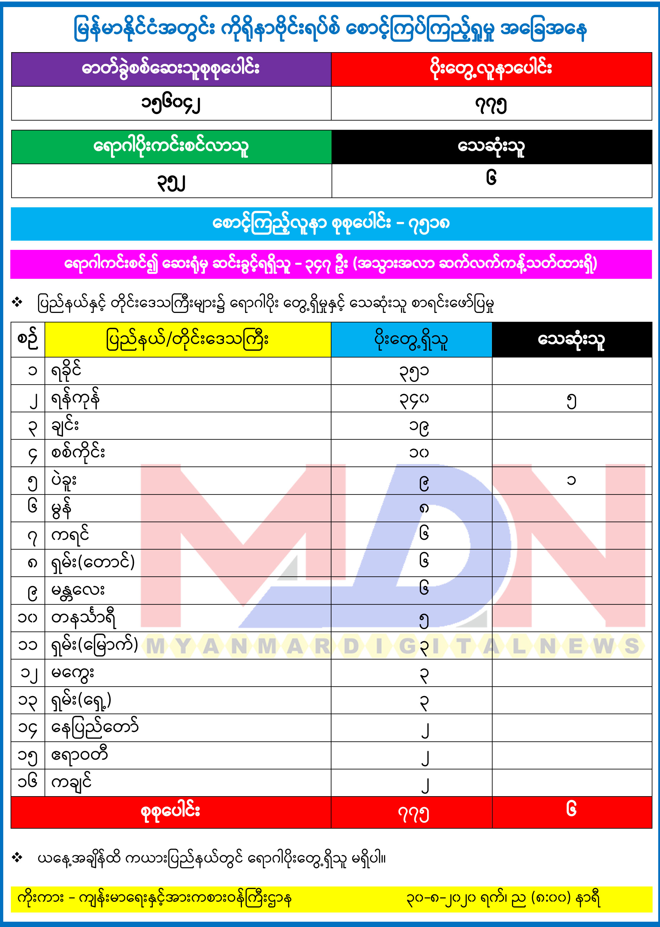 ရောဂါပိုးတွေ့ရှိသူ ၇၇၅ ဦးအနက် သေဆုံးသူ ခြောက်ဦး၊ ပိုးမတွေ့ရှိတော့သူ ၃၅၂ ဦး၊ ဆေးရုံမှ ဆင်းခွင့်ပြုခဲ့သူ ၃၄၇ ဦးနှင့် ဩဂုတ် ၂၉ ရက် မွန်းတည့် ၁၂ နာရီမှ ဩဂုတ် ၃၀ မွန်းတည့် ၁၂ နာရီအတွင်း စောင့်ကြည့်လူနာအသစ် ၅၃ ဦး ရှိကြောင်း ကျန်းမာရေးနှင့် အားကစားဝန်ကြီးဌာန၏ ယနေ့ထုတ်ပြန်ချက်များအရ သတင်းရရှိသည်။