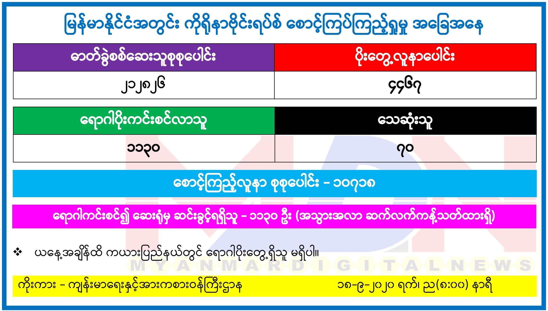 ယနေ့တွင် ကိုဗစ် - ၁၉ ရောဂါပိုးရှိသူ ၄၂၄ ဦး ထပ်မံတွေ့ရှိသဖြင့် ယနေ့အထိ ရောဂါပိုးရှိသူ စုစုပေါင်း ၄၄၆၇ ဦးရှိသွားပြီဖြစ်ကြောင်း၊ ရောဂါပိုးတွေ့ ရှိသူ ၄၄၆၇ ဦးအနက် သေဆုံးသူ ၇၀၊ ဆေးရုံမှဆင်းခွင့်ပြုခဲ့သူ ၁၁၃၀ နှင့် စက်တင် ဘာ ၁၇ ရက်မွန်းတည့် ၁၂ နာရီမှ စက်တင်ဘာ ၁၈ ရက်မွန်းတည့် ၁၂ နာရီအတွင်း စောင့်ကြည့်လူနာအသစ် ၃၁၃ ဦးရှိကြောင်း ကျန်းမာရေးနှင့်အားကစားဝန်ကြီးဌာန၏ ယနေ့ထုတ်ပြန်ချက်များအရ သတင်းရရှိသည်။