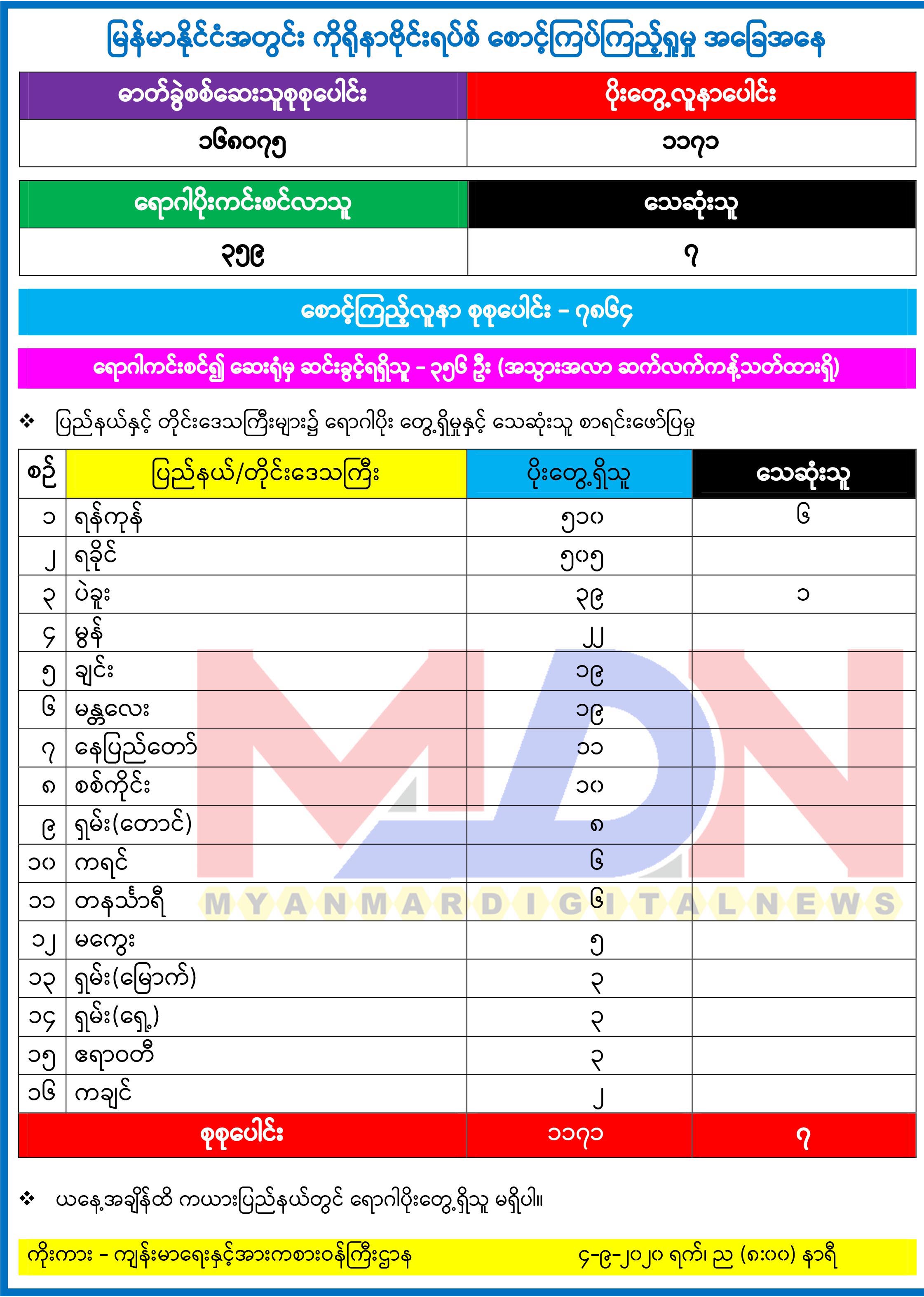 ယနေ့တွင် ကိုဗစ် - ၁၉ ရောဂါပိုးရှိသူ ၆၀ ထပ်မံတွေ့ရှိသဖြင့် ယနေ့အထိ ရောဂါပိုးရှိသူ စုစုပေါင်း ၁၁၇၁ ဦး ရှိသွားပြီဖြစ်ကြောင်း၊ ရောဂါပိုးတွေ့ရှိသူ ၁၁၇၁ ဦးအနက် သေဆုံးသူ ခုနှစ်ဦး၊ ပိုးမတွေ့ရှိတော့သူ ၃၅၉ ဦး၊ ဆေးရုံမှ ဆင်းခွင့်ပြုခဲ့သူ ၃၅၆ ဦးနှင့် စက်တင်ဘာ ၃ ရက်မွန်းတည့် ၁၂ နာရီမှ စက်တင်ဘာ ၄ ရက် မွန်းတည့် ၁၂ နာရီအတွင်း စောင့်ကြည့်လူနာအသစ် ၉၈ ဦး ရှိကြောင်း ကျန်းမာရေးနှင့်အားကစားဝန်ကြီးဌာန၏ ယနေ့ ထုတ်ပြန်ချက်များအရ သတင်းရရှိသည်။