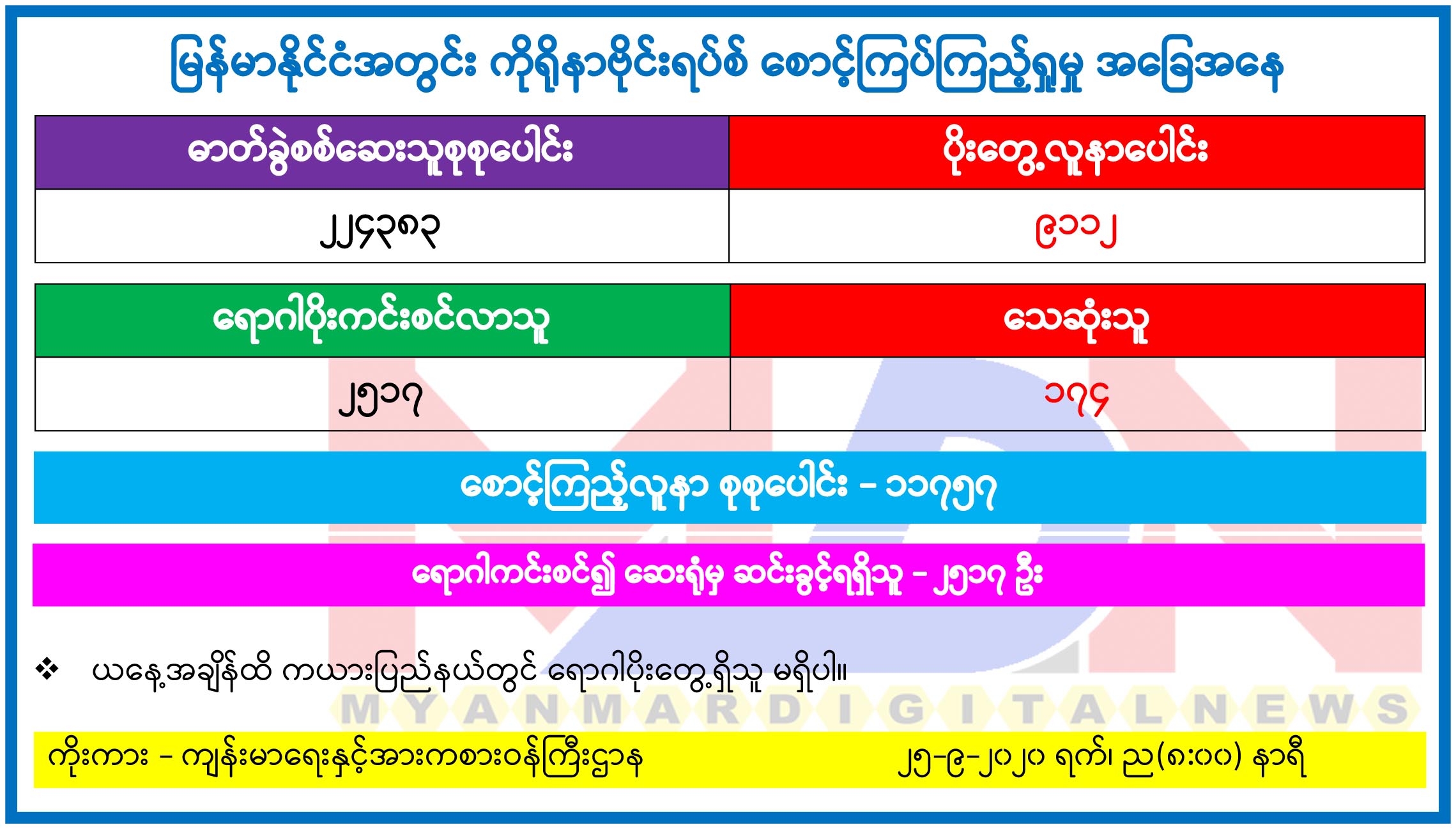 ယနေ့တွင် ကိုဗစ်-၁၉ ရောဂါပိုးရှိသူ ၇၆၉ ဦးထပ်မံတွေ့ရှိသဖြင့် ယနေ့အထိ ရောဂါပိုးရှိသူ စုစုပေါင်း ၉၁၁၂ ဦးရှိသွားပြီဖြစ်ကြောင်း၊ ရောဂါပိုးတွေ့ရှိသူ ၉၁၁၂ ဦးအနက် သေဆုံးသူ ၁၇၄ ဦး၊ ဆေးရုံမှဆင်းခွင့်ပြုခဲ့သူ ၂၅၁၇ ဦးနှင့် စက်တင်ဘာ ၂၄ ရက် မွန်းတည့် ၁၂ နာရီမှ စက်တင်ဘာ ၂၅ ရက် မွန်းတည့် ၁၂ နာရီအတွင်း စောင့်ကြည့်လူနာအသစ် ၄၄၅ ဦးရှိကြောင်း ကျန်းမာရေးနှင့် အားကစားဝန်ကြီးဌာန၏ ယနေ့ထုတ်ပြန်ချက်များအရ သတင်းရရှိသည်။