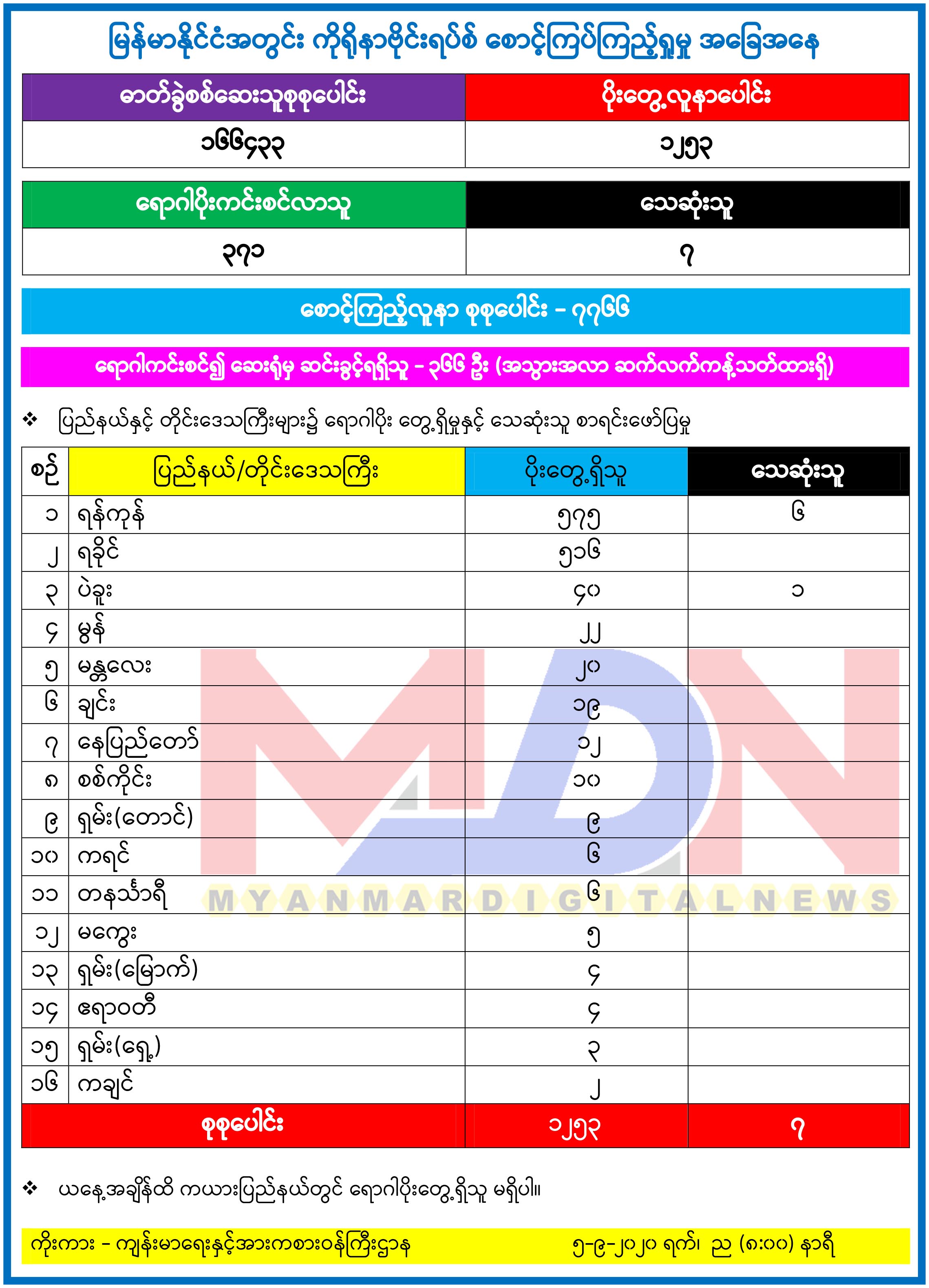 ယနေ့တွင် ကိုဗစ် - ၁၉ ရောဂါပိုးရှိသူ ၈၂ ဦးထပ်မံတွေ့ရှိသဖြင့် ယနေ့အထိ ရောဂါပိုးရှိသူ စုစုပေါင်း ၁၂၅၃ ဦးရှိသွားပြီဖြစ်ကြောင်း၊ ရောဂါပိုးတွေ့ရှိသူ ၁၂၅၃ ဦးအနက် သေဆုံးသူ ခုနှစ်ဦး၊ ပိုးမတွေ့ရှိတော့သူ ၃၇၁ ဦး၊ ဆေးရုံမှဆင်းခွင့်ပြုခဲ့သူ ၃၆၆ ဦးနှင့် စက်တင်ဘာ ၄ ရက်မွန်းတည့် ၁၂ နာရီမှ စက်တင်ဘာ ၅ ရက်မွန်းတည့် ၁၂ နာရီအတွင်း စောင့်ကြည့်လူနာအသစ် ၁၁၉ ဦး ရှိကြောင်း ကျန်းမာရေးနှင့်အားကစား ဝန်ကြီးဌာန၏ ယနေ့ထုတ်ပြန်ချက်များအရ သတင်းရရှိသည်။