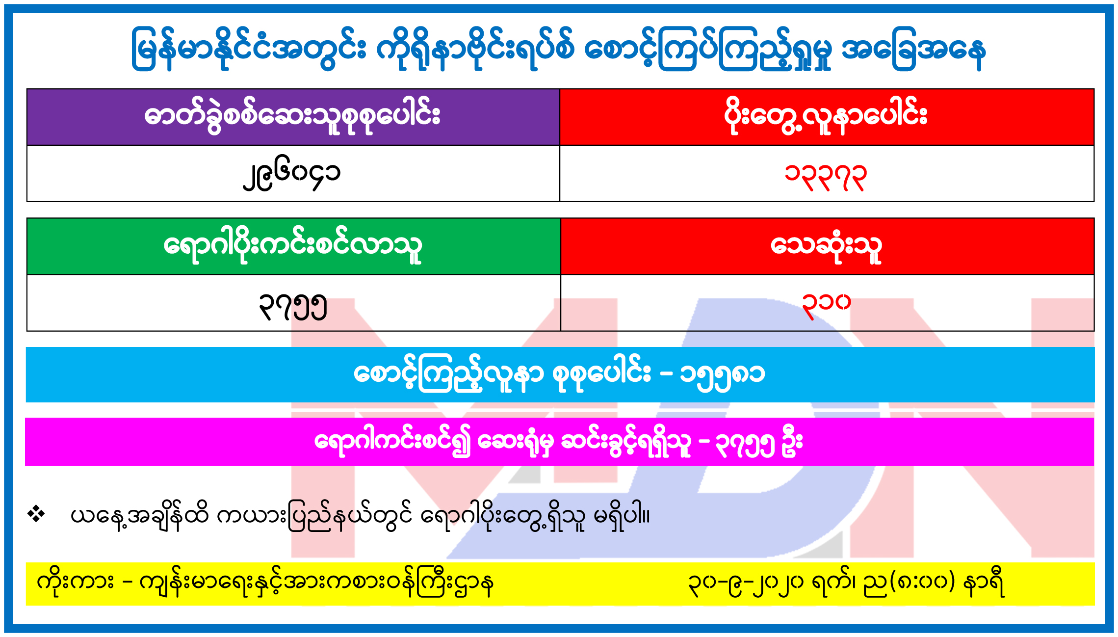 စက်တင်ဘာ ၂၉ ရက် ည ၈နာရီမှ စက်တင်ဘာ ၃၀ ရက် ည ၈ နာရီအတွင်း ဓာတ်ခွဲနမူနာ ၆၂၆၂ ခုအား စစ်ဆေးခဲ့ရာ ကိုဗစ်-၁၉ ရောဂါပိုးရှိသူ ၉၄၆ ဦး ထပ်မံ တွေ့ရှိသဖြင့် ယနေ့အထိ ရောဂါပိုးရှိသူစုစုပေါင်း ၁၃၃၇၃ ဦးရှိသွားပြီဖြစ်ကြောင်း၊ ရောဂါပိုးတွေ့ရှိ သူ ၁၃၃၇၃ ဦးအနက် သေဆုံးသူ ၃၁၀ နှင့် ဆေးရုံမှဆင်းခွင့်ပြုခဲ့သူ ၃၇၅၅ ဦးရှိကြောင်း ကျန်းမာရေးနှင့်အားကစားဝန်ကြီးဌာန၏ ယနေ့ထုတ်ပြန်ချက် များအရ သတင်းရရှိသည်။