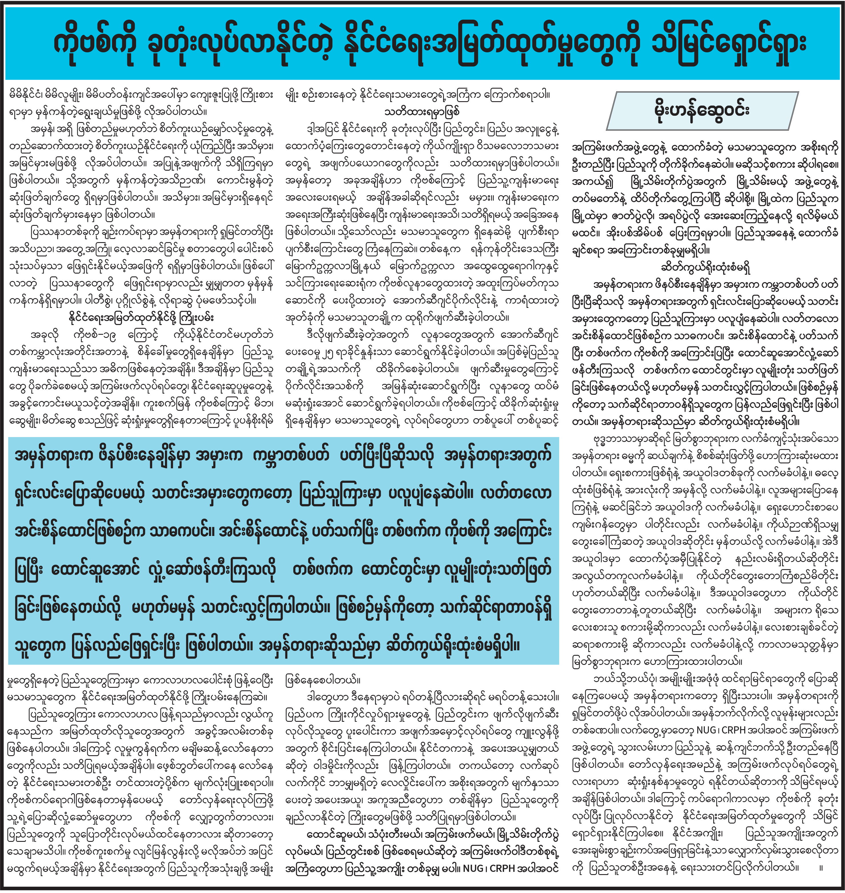 ကိုဗစ်ကို ခုတုံးလုပ်လာနိုင်တဲ့ နိုင်ငံရေးအမြတ်ထုတ်မှုတွေကို သိမြင်ရှောင်ရှား