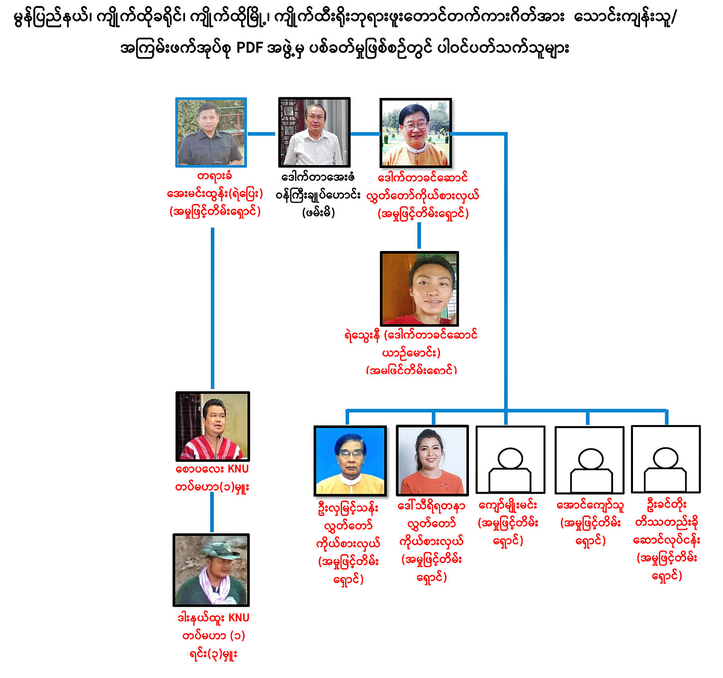 အေးမင်းထွန်း (ရဲပြေး)သည် KNU တပ်မဟာ (၁) တွင် ခိုလှုံခဲ့ပြီးနောက် မွန်ပြည်နယ် လွှတ်တော်ကိုယ်စားလှယ်များ ဖြစ်ကြသည့် ဒေါက်တာ ခင်ဆောင် (တရားခံပြေး)၊ ဦးလှမြင့်သန်း (တရားခံ ပြေး)၊ ဒေါ်သီရိရတနာ (တရားခံပြေး)၊ လုပ်ငန်းရှင်များ ဖြစ်ကြသည့် ကျော်မျိုးမင်း (တရားခံပြေး)၊ အောင်ကျော်သူ (တရားခံပြေး)၊ ဦးခင်တိုး(တရားခံပြေး) တို့နှင့် ဆက်သွယ်ဆောင်ရွက်လျက်ရှိကြောင်း၊ ရဲသွေးနီး၊ KNU တပ်မဟာ (၁)၊ ရင်း(၃)မှူး ဒါးနယ်ထူးတို့နှင့် ပူးပေါင်းကာ စက်တင်ဘာ ၁၅ ရက်ကလည်း ဘီးလင်း ရဲစခန်းနယ်မြေတွင် DENKO ဆီဆိုင်မှ ဆီဘောက်ဆာယာဉ်တစ်စီးကို ပြန်ပေးဆွဲခဲ့သဖြင့် ဘီးလင်းမြို့မရဲစခန်းမှ ရာဇသတ် ကြီးပုဒ်မ ၃၉၂/၃၆၅ အရ ဖမ်းဆီးရန် အလိုရှိနေသော တရားခံများ ဖြစ်ကြောင်း။