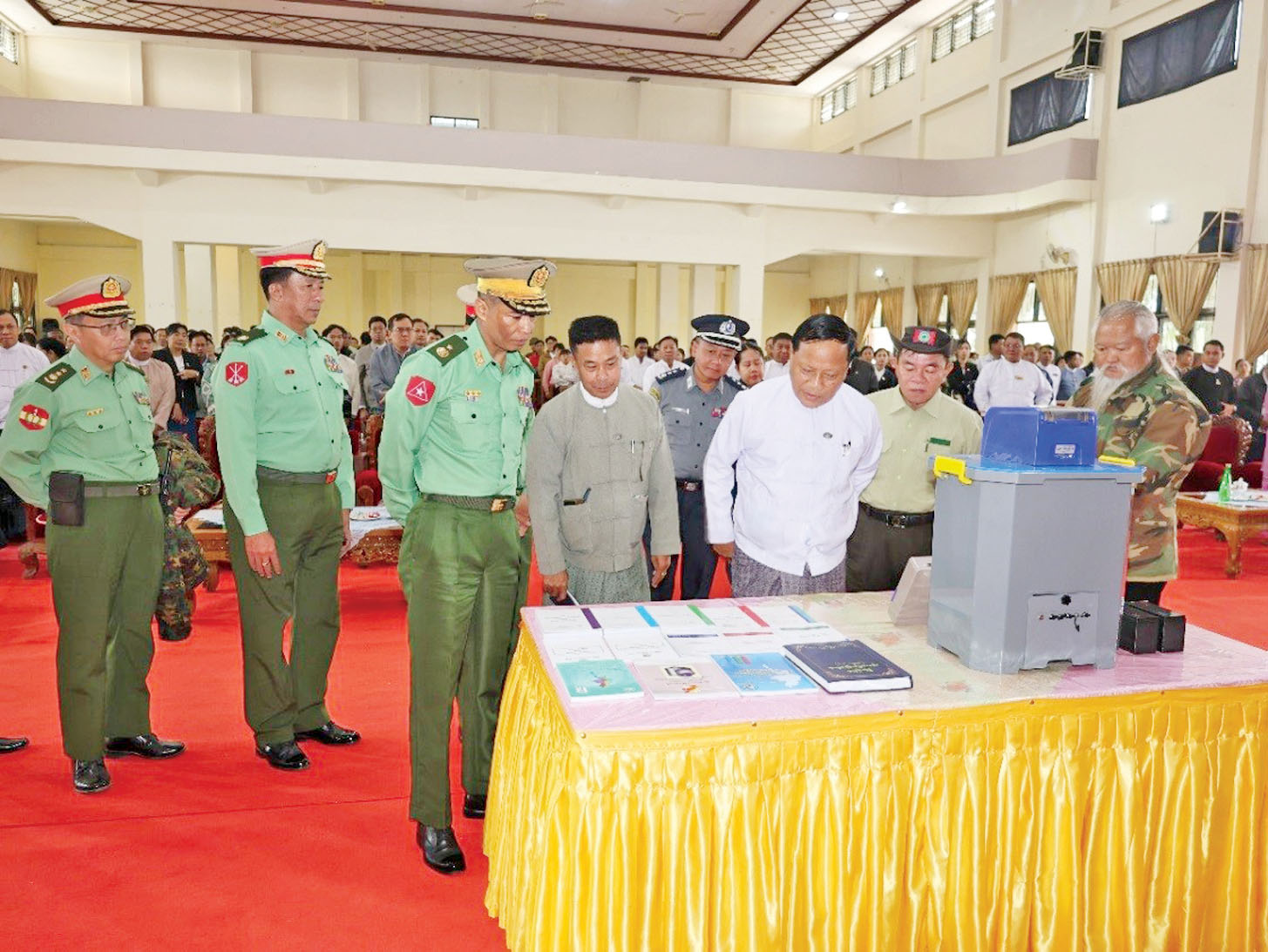 ထို့နောက် တိုင်းမှူးနှင့် တာဝန်ရှိသူများက တက်ရောက်လာကြသူများအား ရင်းရင်းနှီးနှီး လိုက်လံနှုတ်ဆက်ကာ ခင်းကျင်းပြသထားသည့် မြန်မာအီလက်ထရောနစ် မဲပေးစက်(MEVM)နှင့် အထွေထွေရွေးကောက်ပွဲဆိုင်ရာ အသိပညာပေး စာအုပ်စာစောင်များကို လှည့်လည်ကြည့်ရှုပြီး လိုအပ်သည်များကို ပေါင်းစပ်ညှိနှိုင်းပေးသည်။