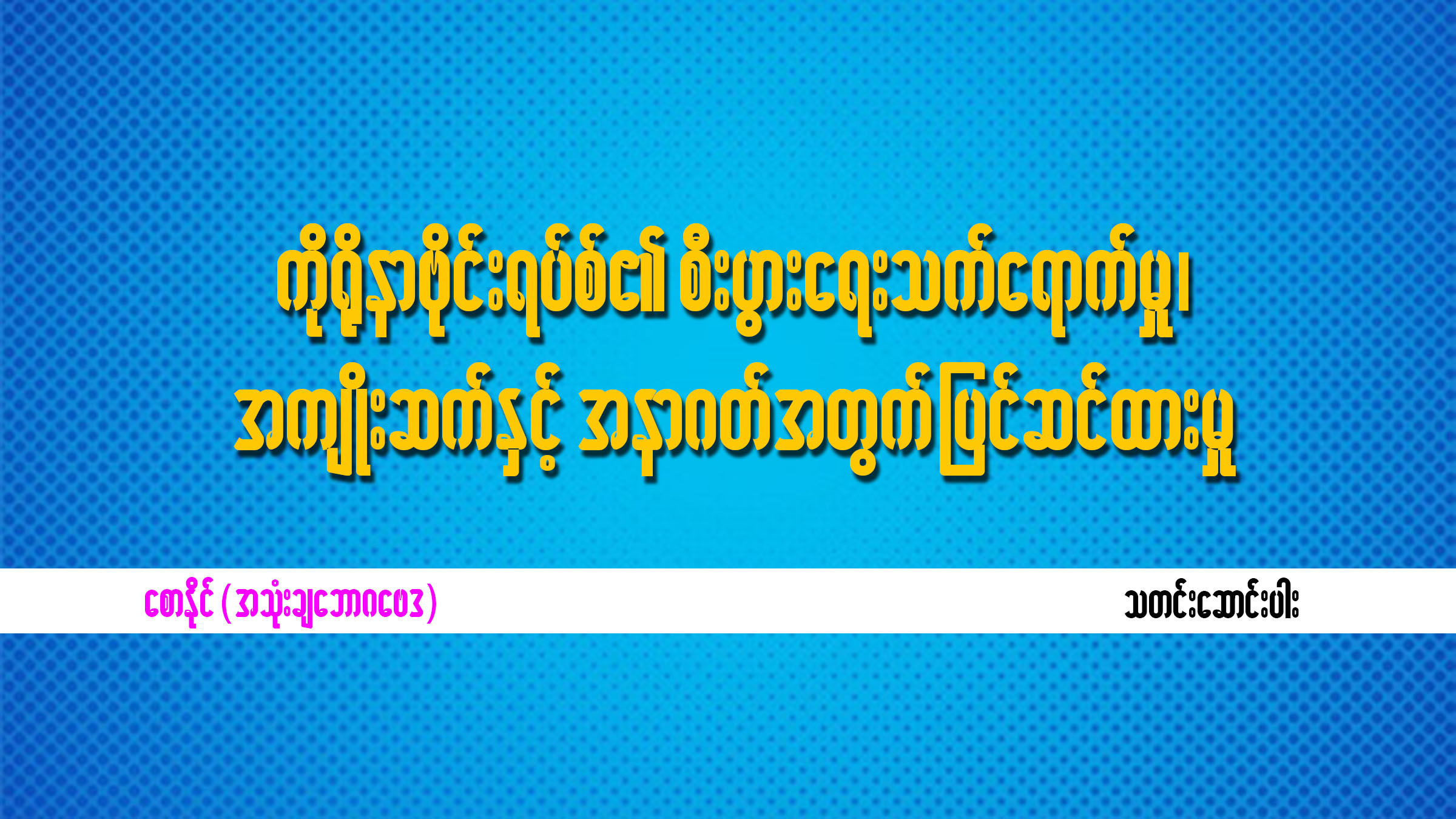 (၁၂) အတိတ်၊ ပစ္စုပ္ပန်၊ အနာဂတ် ကာလသုံးပါးတွင် လူသားတို့ လက်တွေ့ကျကျပိုင်ဆိုင်သည်မှာ ယခုလက်ရှိပစ္စုပ္ပန် ကာလပင်ဖြစ်သည်။ လတ်တလောကာလတွင် ကမ္ဘာကြီး ကိုရိုနာဗိုင်းရပ်စ်အန္တရာယ်မှ ပြန်လည်ရုန်းထလာနိုင်ရေးအတွက် အားထုတ်ကုစားရင်း ထပ်မံဖြစ်ပေါ်လာနိုင်သည့် အနာဂတ်ကာလ မသေချာမှုများ၊ ဘေးအန္တရာယ်အမျိုးမျိုးအတွက် ပြင်ဆင်ရန် အချိန်ကောင်းဟုသာ မှတ်ယူရပေမည်။