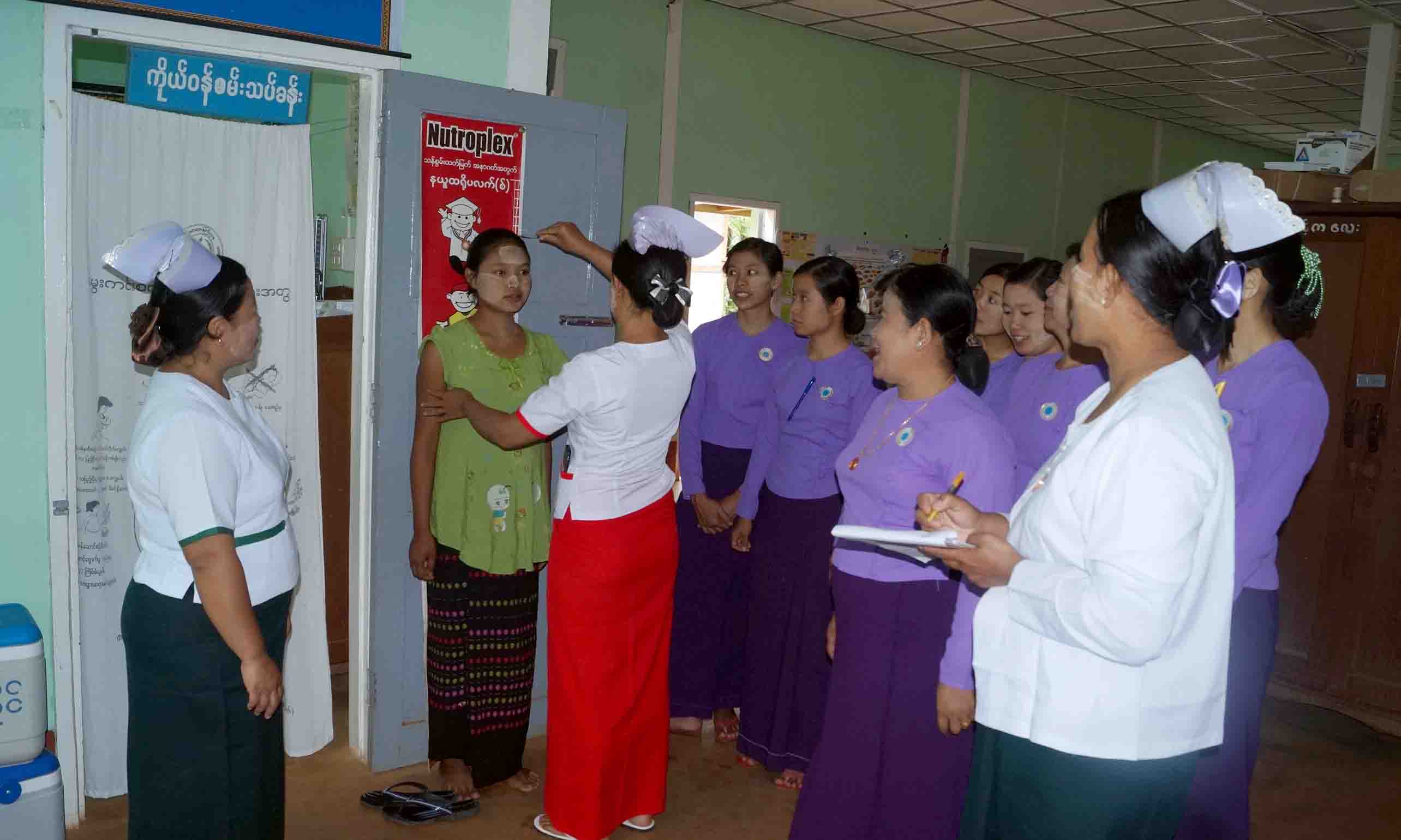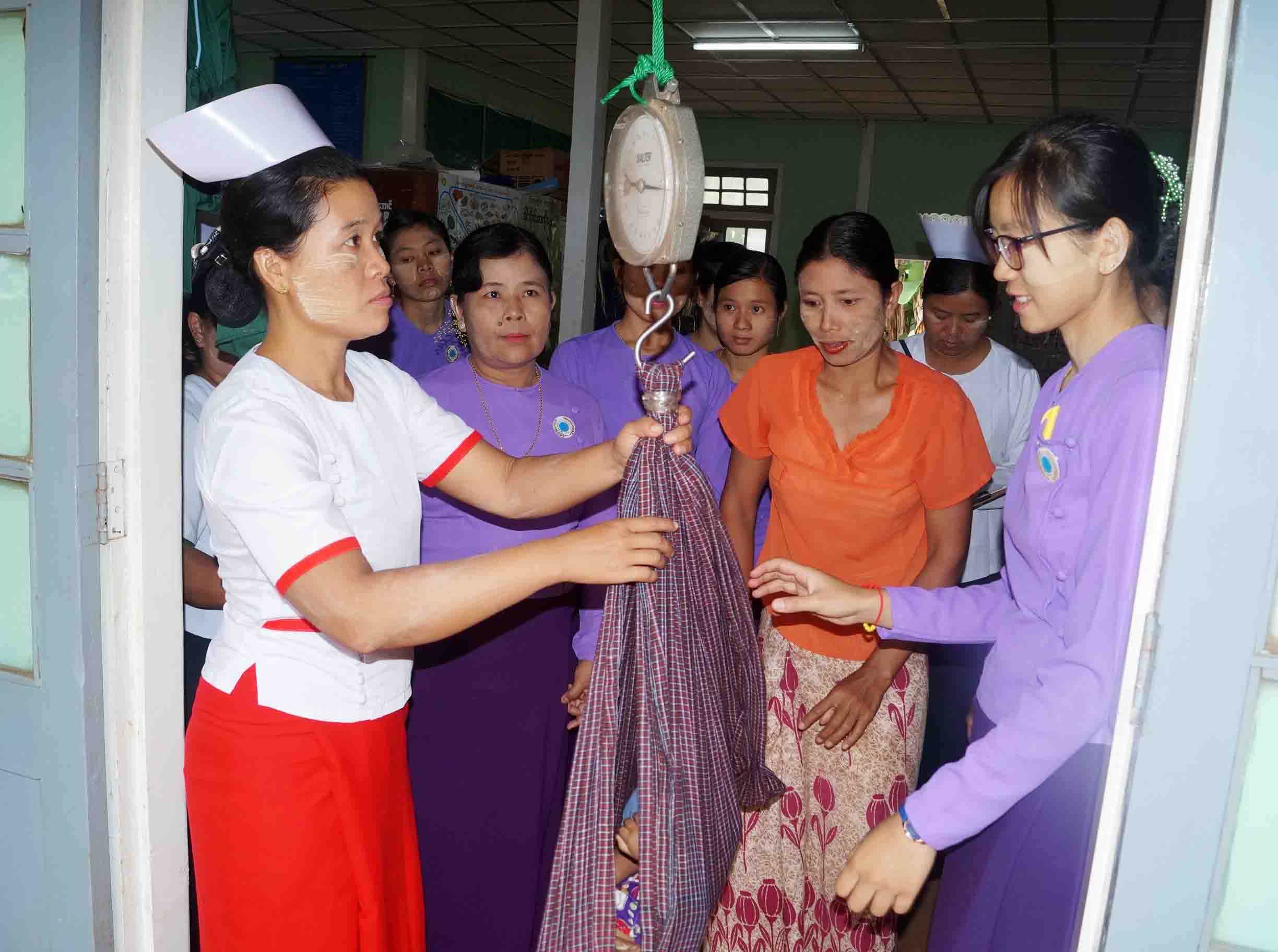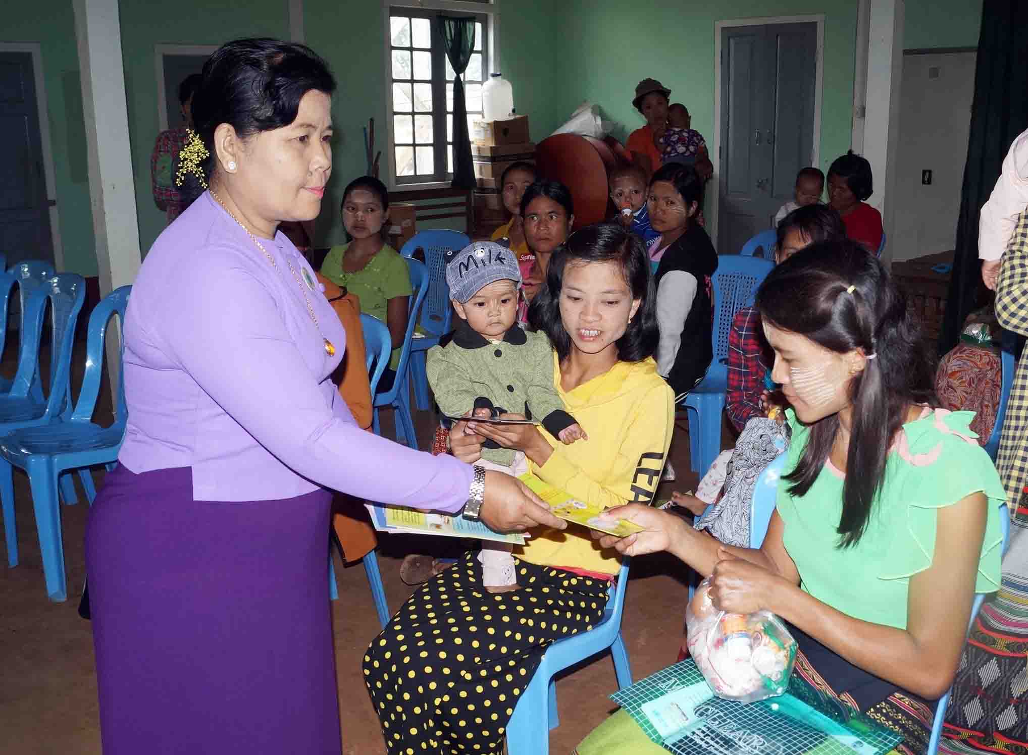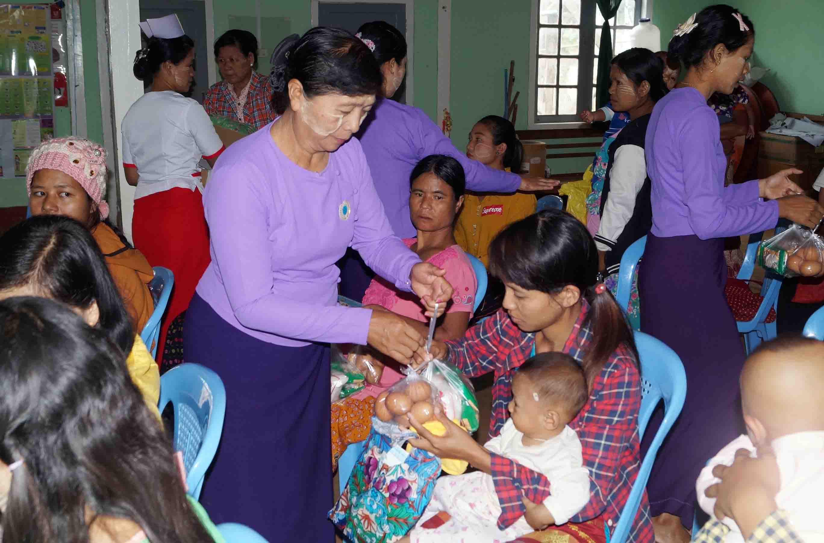 ရှေးဦးစွာ မြို့နယ်မိခင်နှင့်ကလေးစောင့်ရှောက်ရေးအသင်းဥက္ကဋ္ဌ ဒေါ်မြင့်သီနှင့် မြို့နယ်သူနာပြု အဆင့်(၁) ဒေါ်စန်းဘီးထူးတို့က အဟာရထောက်ပံ့ပေးရခြင်းနှင့် ကျန်းမာရေးအသိပညာဗဟုသုတများ အကြောင်းကို ရှင်းလင်းပြောကြားပြီး ကိုယ်ဝန်ဆောင်မိခင်လောင်းနှင့် နို့တိုက်မိခင်များအား တစ်ဦးလျှင် သံဓါတ်အားဆေး(၁)ဘူး၊ ကြက်ဥ(၇)လုံး၊ ပြောင်းမစ်အထုတ်သေး(၁၀)ထုပ်၊ ကုလားပဲ (၂၅)ကျပ်သား၊ အိုင်အိုဒင်းဆားတစ်ထုပ်တို့ကို လည်းကောင်း၊ ကျန်းမာရေးစောင့်ရှောက်မှုအဖြစ် အသက်(၂)နှစ်အောက် ကလေးငယ်များအား ပေါင်ချိန်ပေးခြင်း၊ ကိုယ်ဝန်ဆောင်မိခင်းလောင်းများအား ကိုယ်အလေးချိန်တိုင်းပေး ခြင်း၊ အရပ်တိုင်းပေးခြင်းနှင့် ကိုယ်ဝန်ဆောင်ဗိုက်အားစပ်သပ်ပေးခြင်းများ ဆောင်ရွက်ပေးခဲ့ပြီး ကျန်းမာရေးအသိပညာပေးလက်ကမ်းစာစောင်များ ဖြန့်ဝေးပေးခဲ့ကြောင်း သိရသည်။