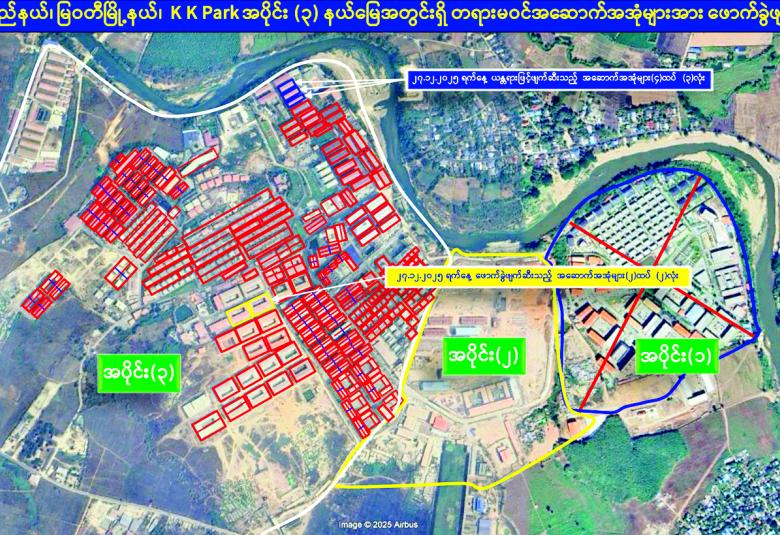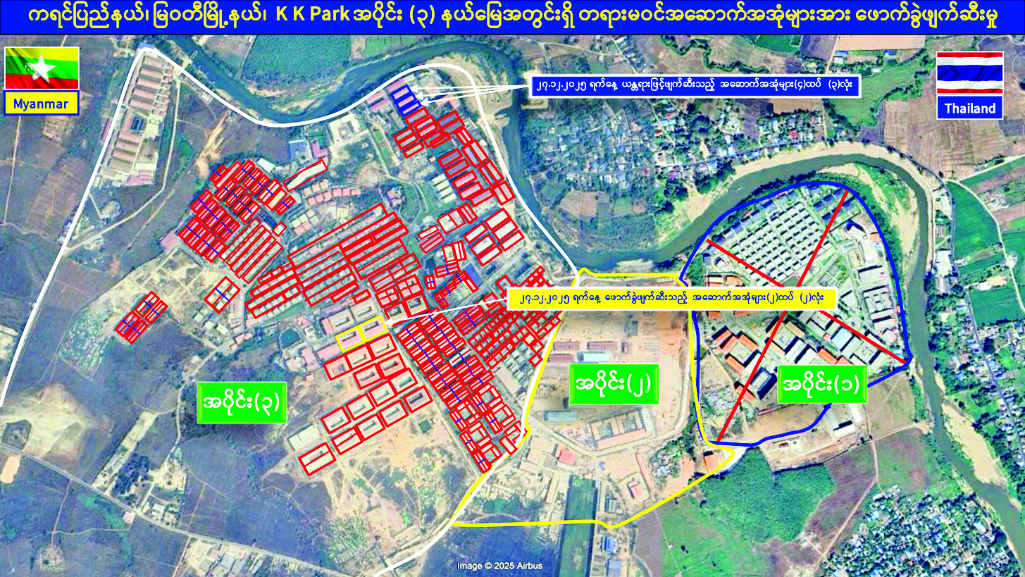 ယနေ့တွင် မြဝတီ-မဲ့ထော်သလေး (KK Park) အပိုင်း (၃) နယ်မြေအတွင်းရှိ အွန်လိုင်း လိမ်လည်လောင်းကစားမှုများ ကျူးလွန်ရာတွင် အသုံးပြုခဲ့သည့် တရားမဝင် လေးထပ် အဆောက်အအုံ သုံးလုံး၊ နှစ်ထပ်အဆောက်အအုံ နှစ်လုံး စုစုပေါင်း တရားမဝင်အဆောက်အအုံ ငါးလုံးတို့ကို ထပ်မံဖြိုချဖျက်ဆီးခဲ့သဖြင့် KK Park နယ်မြေအတွင်းရှိ တရားမဝင်အဆောက်အအုံ စုစုပေါင်း ၆၃၅ လုံး အနက် ၅၀၉ လုံးကို စနစ်တကျ ဖြိုချဖျက်ဆီးပြီးဖြစ်ကြောင်း သိရှိရသည်။