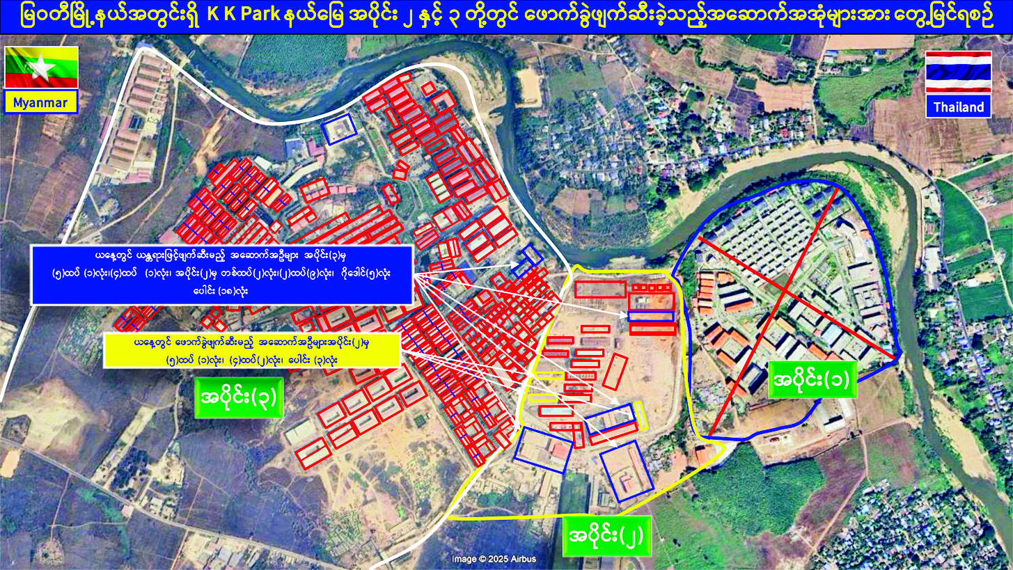 ယနေ့တွင် မြဝတီ-မဲ့ထော်သလေး (KK Park) အပိုင်း (၃) နယ်မြေအတွင်းရှိ အွန်လိုင်းလိမ်လည် လောင်းကစားမှုများ ကျူးလွန်ရာတွင် အသုံးပြုခဲ့သည့် တရားမဝင် လေးထပ်အဆောက် အအုံတစ်လုံး၊ ငါးထပ်အဆောက် အအုံတစ်လုံးနှင့် အပိုင်း (၂) နယ်မြေအတွင်းရှိ အွန်လိုင်းလိမ်လည် လောင်းကစားမှုများ ကျူးလွန်ရာတွင် အသုံးပြုခဲ့သည့် တရားမဝင် တစ်ထပ်အဆောက်အအုံ ခုနစ်လုံး၊ နှစ်ထပ်အဆောက်အအုံ ၁၀ လုံး၊ လေးထပ်အဆောက်အအုံ နှစ်လုံး စုစုပေါင်း တရားမဝင် အဆောက်အအုံ ၂၁ လုံးတို့ကို ထပ်မံဖြိုချဖျက်ဆီးခဲ့သဖြင့် KK Park နယ်မြေအတွင်းရှိ တရားမဝင် အဆောက်အအုံ စုစုပေါင်း ၆၃၅ လုံး အနက် ၆၃၁ လုံးကို စနစ်တကျ ဖြိုချဖျက်ဆီးပြီးဖြစ်ကြောင်း သိရသည်။