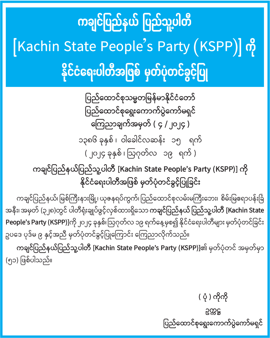 ကချင်ပြည်နယ် ပြည်သူ့ပါတီ [Kachin State People’s Party (KSPP)] ကို နိုင်ငံရေးပါတီအဖြစ် မှတ်ပုံတင်ခွင့်ပြု