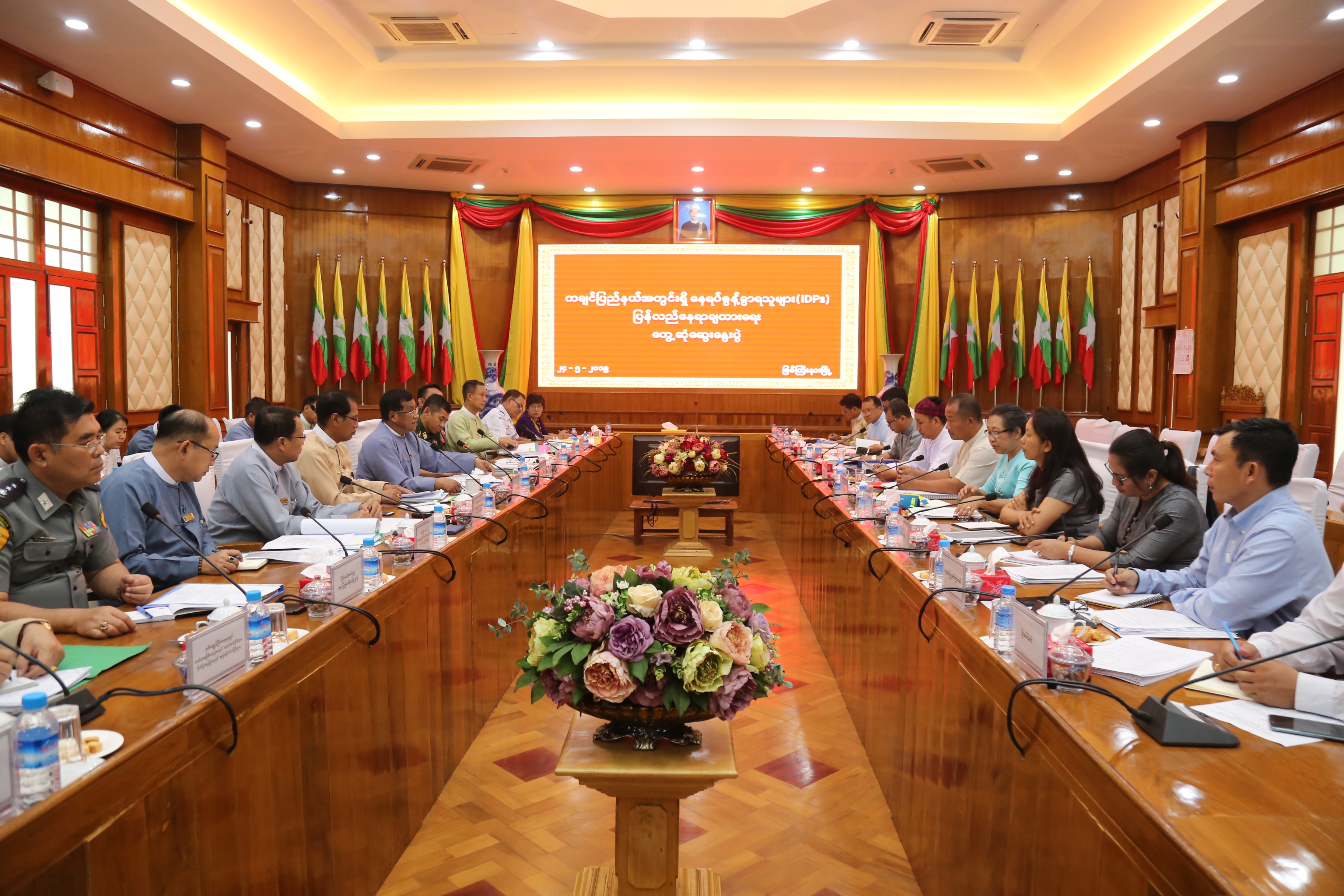 ကချင်ပြည်နယ်အတွင်းရှိ နေရပ်စွန့်ခွာရသူများ (IDPs) ပြန်လည်နေရာချထားမှု အကောင်အထည်ဖော်ရေးဆိုင်ရာ လုပ်ငန်းအဖွဲ့နှင့် ကချင်ဒေသစစ်ဘေးရှောင် ပြည်သူများအား ကူညီ စောင့်ရှောက်ရေး ကော်မတီ (KHCC) တို့၏ ပထမအကြိမ် ညှိနှိုင်းအစည်းအဝေးကို ယနေ့နံနက်ပိုင်းတွင် ကချင်ပြည်နယ်မြစ်ကြီးနားမြို့၊ ကချင်ပြည်နယ်အစိုးရအဖွဲ့ အစည်းအဝေး ခန်းမ၌ ကျင်းပသည်။