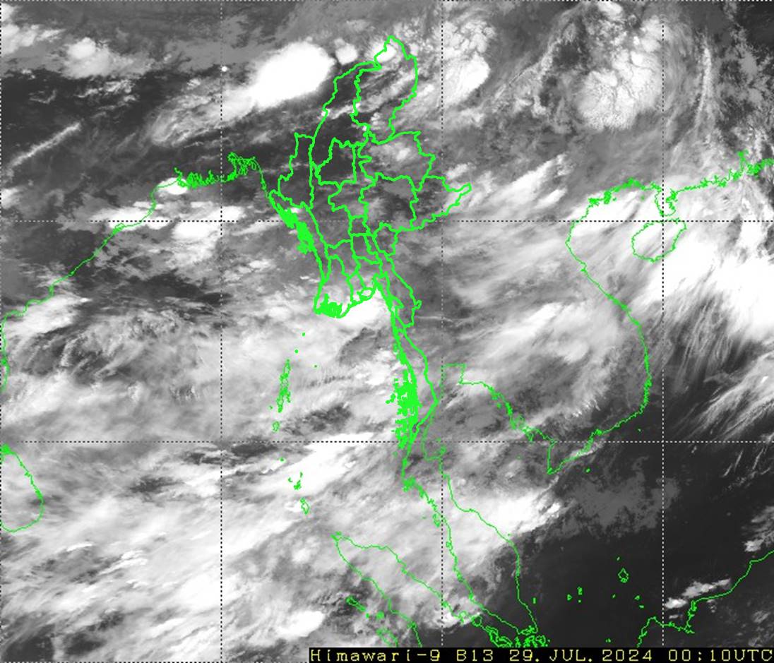 ယနေ့ညနေအထိ ခန့်မှန်းချက်အနေဖြင့် စစ်ကိုင်းတိုင်းဒေသကြီးအောက်ပိုင်းတွင် နေရာကွက်ကျား၊ မန္တလေးတိုင်းဒေသကြီး၊ မကွေးတိုင်းဒေသကြီးနှင့် ကယားပြည်နယ်တို့တွင် နေရာကျဲကျဲ၊ နေပြည်တော်နှင့် ရှမ်းပြည်နယ် (မြောက်ပိုင်းနှင့် အရှေ့ပိုင်း) တို့တွင် နေရာစိပ်စိပ်နှင့် ကျန်တိုင်းဒေသကြီးနှင့် ပြည်နယ်တို့တွင် နေရာအနှံ့အပြား မိုးထစ်ချုန်းရွာပြီး၊ ပဲခူးတိုင်းဒေသကြီး၊ ရန်ကုန်တိုင်းဒေသကြီး၊ ဧရာဝတီတိုင်းဒေသကြီး၊ တနင်္သာရီတိုင်းဒေသကြီး၊ ရခိုင်ပြည်နယ်နှင့် မွန်ပြည်နယ်တို့တွင် ဒေသအလိုက်နှင့် ကချင်ပြည်နယ်နှင့် ကရင်ပြည်နယ်တို့တွင် နေရာကွက်၍ မိုးကြီးနိုင်သည်။ ရွာရန်ရာနှုန်းပြည့် ဖြစ်သည်။
