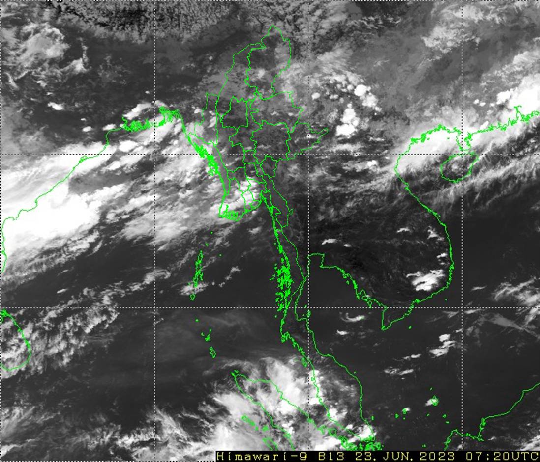 ယနေ့နံနက်(၀၉:၃၀)နာရီအချိန်ထိမိုးလေဝသတိုင်းထွာချက်အကျဉ်းချုပ်။ လွန်ခဲ့သော (၂၄)နာရီအတွင်းက ကယားပြည်နယ်တွင် တိမ်အသင့်အတင့် ဖြစ်ထွန်း ခဲ့ပြီး၊ ရှမ်းပြည်နယ်(တောင်ပိုင်း)တွင် နေရာကွက်ကျား၊ စစ်ကိုင်းတိုင်းဒေသကြီးအောက်ပိုင်းနှင့် မကွေးတိုင်းဒေသကြီးတို့တွင် နေရာကျဲကျဲ၊ မန္တလေးတိုင်း ဒေသကြီး၊ ပဲခူးတိုင်းဒေသကြီး၊ ရန်ကုန်တိုင်းဒေသကြီး၊ တနင်္သာရီတိုင်းဒေသကြီးနှင့် ရှမ်းပြည်နယ်(အရှေ့ပိုင်း)တို့တွင် နေရာစိပ်စိပ်နှင့် ကျန်တိုင်းဒေသကြီးနှင့် ပြည်နယ်တို့တွင် နေရာအနှံ့အပြား မိုးထစ်ချုန်းရွာခဲ့ကာ၊ မကွေးတိုင်းဒေသကြီးတွင် ဒေသအလိုက်နှင့် စစ်ကိုင်းတိုင်းဒေသကြီးအောက်ပိုင်း၊ ကချင်ပြည်နယ် နှင့် ရခိုင်ပြည်နယ်တို့တွင် နေရာကွက်၍ မိုးကြီးခဲ့ပါသည်။ မှတ်သားဖွယ်ရာ မိုးရေချိန်များမှာ မချမ်းဘောမြို့တွင် (၄.၆၁)လက်မ၊ မြောက်ဦးမြို့တွင် (၃.၀၃) လက်မ၊ မိုးကောင်းမြို့နှင့် ကန့်ဘလူမြို့တို့တွင် (၂.၇၉)လက်မစီ၊ ဟုမ္မလင်းမြို့နှင့် သာပေါင်းမြို့တို့တွင် (၂.၂၀)လက်မစီ၊ တီးတိန်မြို့တွင် (၂.၁၃)လက်မ၊ ပူတာအို မြို့၊ အောင်လံမြို့နှင့် သရက်မြို့တို့တွင် (၁.၉၇)လက်မစီ၊ ဂွမြို့တွင် (၁.၈၉)လက်မနှင့် မိုးကုတ်မြို့တွင် (၁.၈၅)လက်မတို့ ဖြစ်ကြပါသည်။