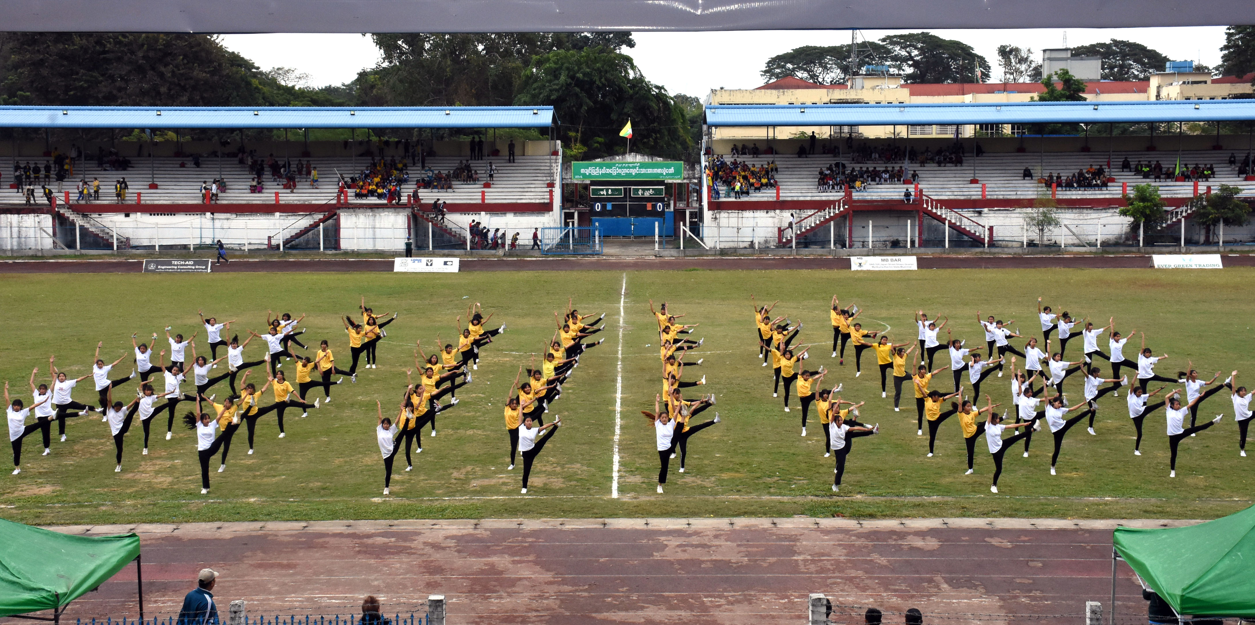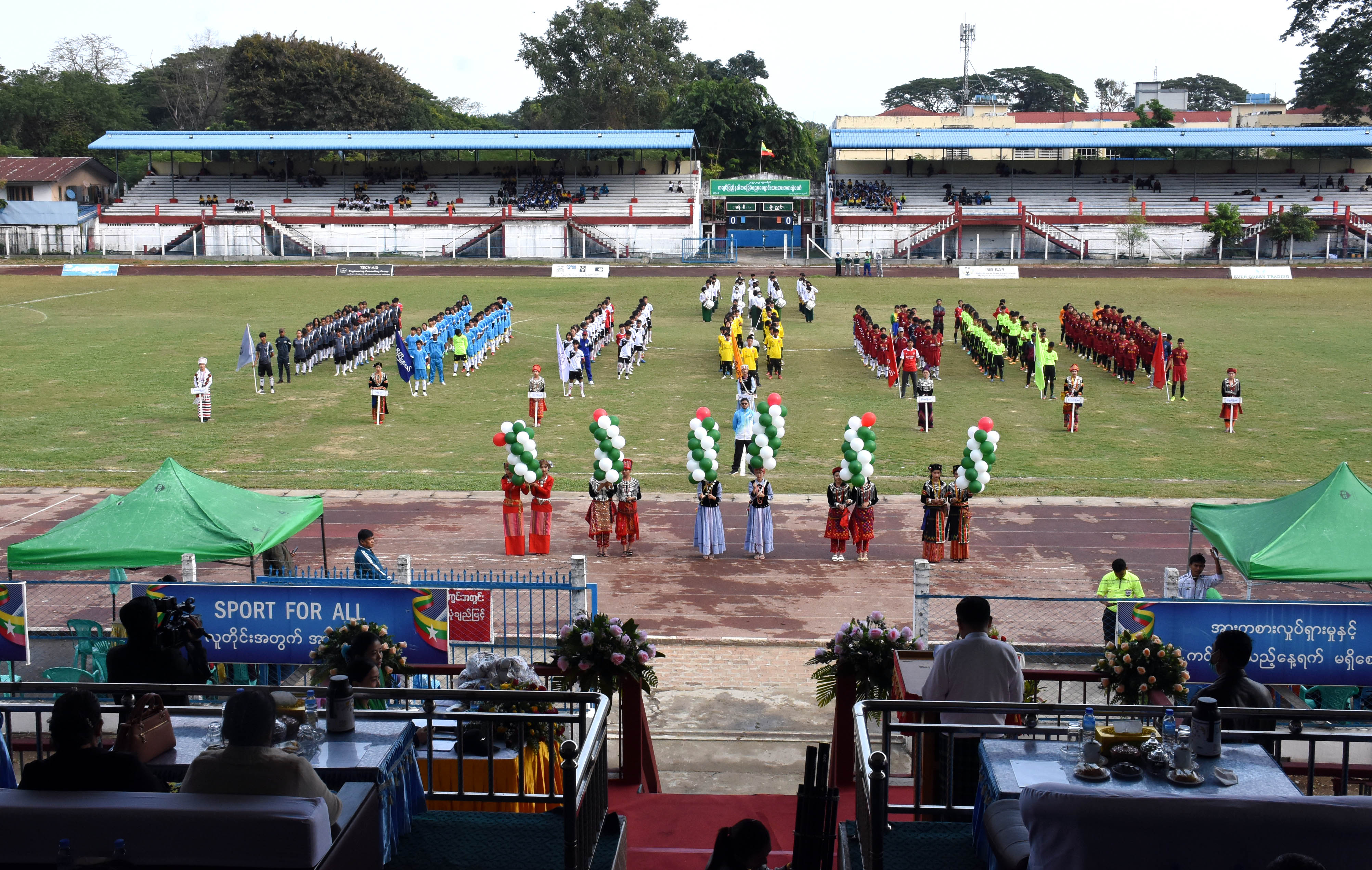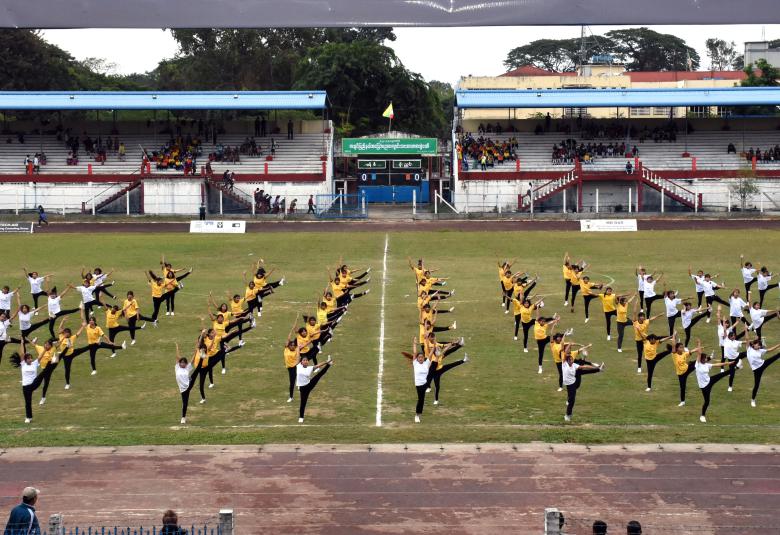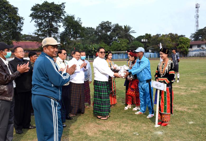ထို့နောက် မြို့နယ်များမှ အားကစားအသင်းများက အားကစားသစ္စာအဓိဌာန် ရွတ်ဆိုကြပြီး ပြည်နယ်ဝန်ကြီးချုပ်၊ ပြည်နယ်တရားလွှတ်တော်တရားသူကြီးချုပ်၊ ပြည်နယ်အစိုးရအဖွဲ့ဝင် ဝန်ကြီး များနှင့် ပြည်နယ်ပညာရေးမှူးတို့က မြို့နယ်အားကစားအသင်းများအား လိုက်လံနှုတ်ဆက်အားပေး ခဲ့ကြကာ အားကစားအထောက်အကူပြုပစ္စည်းများကို အသင်းအုပ်ချုပ်သူများထံ ပေးအပ်ခဲ့ကြသည်။