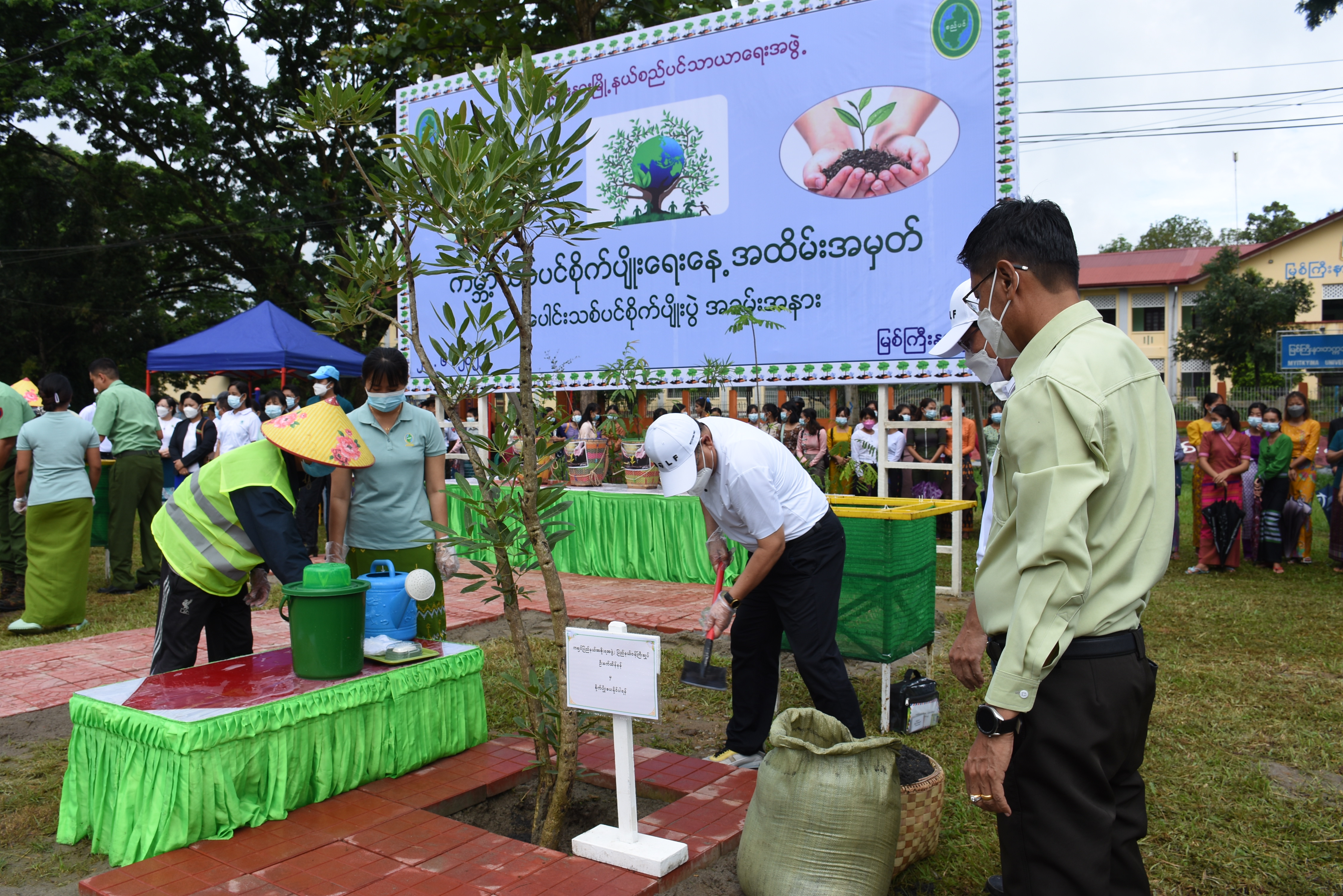 ယင်းနောက် ပြည်နယ်ဝန်ကြီးချုပ်နှင့် ဇနီးဒေါ်နန်ဆိုင်းတို့က ဦးဆောင်၍ ဌာနဆိုင်ရာများ၊ တက္ကသိုလ်ပါမောက္ခချုပ်၊ ပါမောက္ခဌာနမှူးများ၊ ကျောင်းသား/ကျောင်းသူများ၊ လူမှုရေးအသင်းအဖွဲ့များက မြစ်ကြီးနားတက္ကသိုလ် မိန်းလမ်းမကြီးတစ်လျှာက် လမ်းဘေးဝဲ/ယာတွင် စင်္ကာပူချယ်ရီ၊ ဂျပန်ချယ်ရီ၊ သပြဘူတ၊ စိန်ပန်းနီ၊ နွယ်သာကီ၊ ပန်းအိ၊ ခရာဝါ၊ စက္ကူပန်း အစရှိသည့် ပျိုးပင်ပေါင်း (၅၄၀)ပင်ကို စုပေါင်းစိုက်ပျိုးခဲ့ကြပြီး ပြည်နယ်ဝန်ကြီးချုပ်နှင့် တာဝန်ရှိသူများက တက္ကသိုလ်လမ်းမတစ်လျှောက် ပျိုးပင်များ စိုက်ပျိုးထားရှိမှုအား လှည့်လည်ကြည့်ရှုစစ်ဆေးခဲ့ကြသည်။