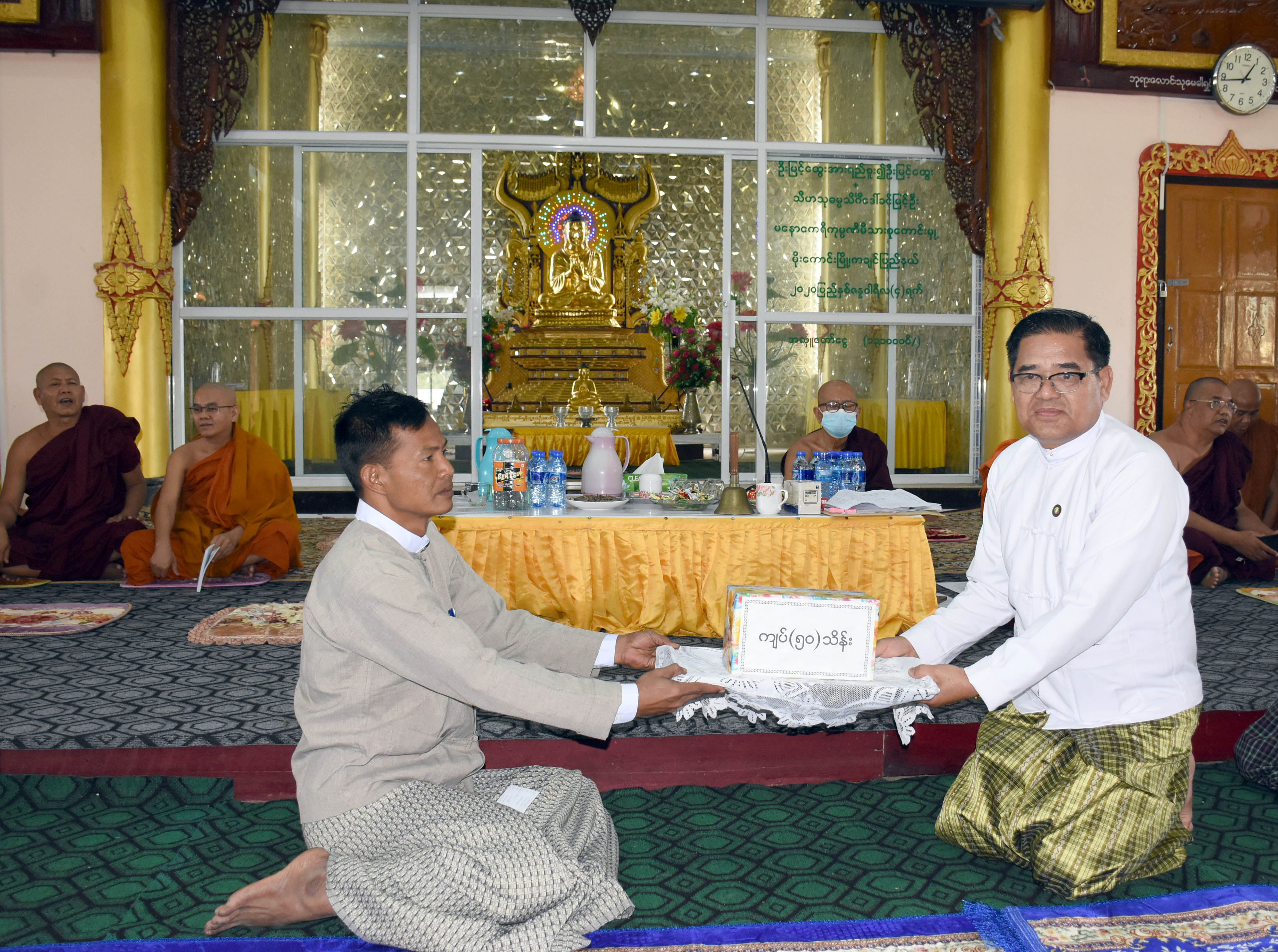 ထိုသို့ ဆက်ကပ်လှူဒါန်းရာတွင် ပြည်နယ်ဝန်ကြီးချုပ်၊ ပြည်နယ်တရားလွှတ်တော် တရားသူကြီးချုပ်၊ ပြည်နယ်အစိုးရအဖွဲ့ဝင် ဝန်ကြီးများ၊ ပြည်နယ်ဥပဒေချုပ်နှင့် ဌာနဆိုင်ရာတာဝန်ရှိသူများသည် မြစ်ကြီးနားစာဖြေဌာန၌ အစိုးရဓမ္မာစရိယစာမေးပွဲဖြေဆိုနေသော သံဃာတော် ၁၁ ပါးနှင့် ပါဠိပထမပြန်စာမေးပွဲဖြေဆိုနေသော သံဃာတော် ၁၁ ပါးတို့ကို ဝန်းသိုကျောင်းတိုက်ဆရာတော် ဦးဆောင်သော အထူးကြီးကြပ်နှင့် ကြီးကြပ်ရေးဆရာတော်များအား ဖူးမြော်ကြည်ညိုပြီး စာမေးပွဲဆိုင်ရာကိစ္စရပ်များ မေးမြန်းလျှောက်ထားတင်ပြကြကာ စာဖြေဆရာတော်များအတွက် အချိုရည်၊ မုန့်များနှင့် အလှူငွေကျပ်သိန်း ၅၀ ကို ပေးအပ်လှူဒါန်းခဲ့သည်။