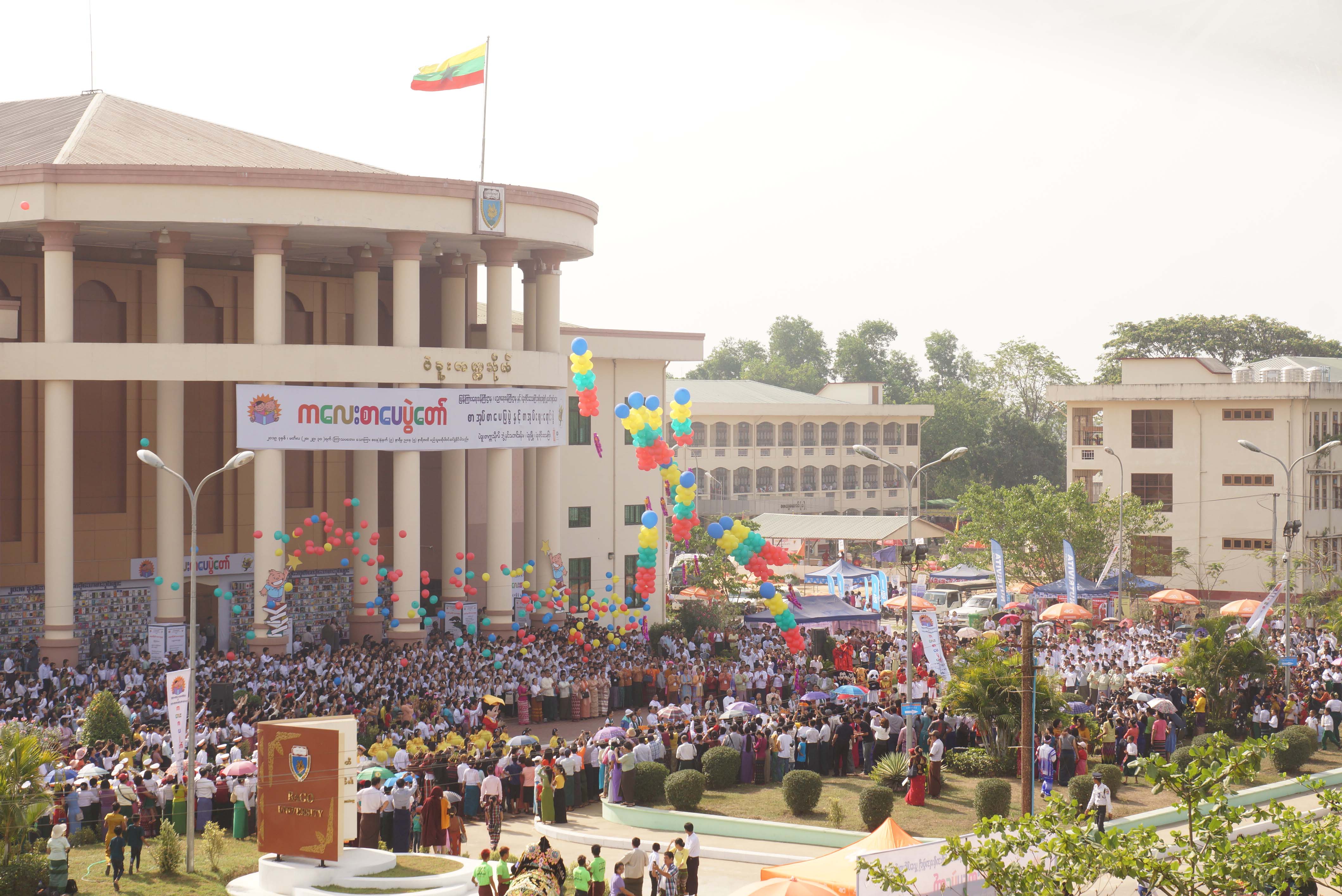 ရှေးဦးစွာ ကလေးစာပေပွဲတော်၊ စာအုပ်စာပေပြပွဲနှင့် စာအုပ်ဈေးရောင်းပွဲ(ပဲခူး) ဖွင့်ပွဲအခမ်းအနားကို ဘွဲ့နှင်းသဘင်ခန်းမရှေ့တွင် ကျင်းပရာ နိုင်ငံတော်သမ္မတ (ငြိမ်း) ဦးထင်ကျော်၊ ပြန်ကြားရေးဝန်ကြီးဌာန ပြည်ထောင်စုဝန်ကြီး ဒေါက်တာဖေမြင့်၊ သာသနာရေးနှင့် ယဉ်ကျေးမှုဝန်ကြီးဌာန ပြည်ထောင်စုဝန်ကြီး သူရဦးအောင်ကို၊ ပညာရေးဝန်ကြီးဌာန ပြည်ထောင်စုဝန်ကြီး ဒေါက်တာမျိုးသိမ်းကြီး၊ ပဲခူးတိုင်းဒေသကြီးအစိုးရအဖွဲ့ ဝန်ကြီးချုပ် ဦးဝင်းသိန်းနှင့် ထူးချွန် ကျောင်းသား ကျောင်းသူ (၆)ဦးတို့က ဖဲကြိုးဖြတ်၍ ဖွင့်လှစ်ပေးသည်။