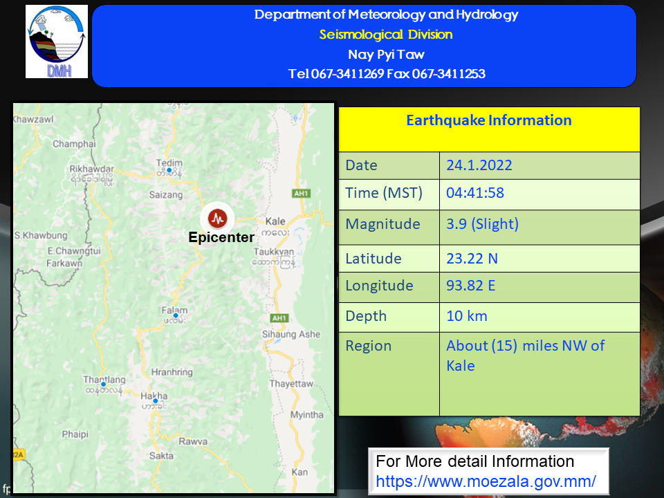 ၂၀၂၂ ခုနှစ်၊ ဇန်နဝါရီလ (၂၄)ရက်နေ့၊ မြန်မာစံတော်ချိန် (၀၄)နာရီ၊ (၄၁)မိနစ်၊ (၅၈)စက္ကန့် အချိန်တွင် ဟားခါးမြေငလျင်စခန်းမှ အရှေ့မြောက်ဘက်(၄၂) မိုင်ခန့်အကွာ၊ မြန်မာနိုင်ငံပြည်တွင်း (ကလေး မြို့၏ အနောက်မြောက်ဘက် (၁၅) မိုင်ခန့်အကွာ)၊ မြောက်လတ္တီတွဒ် (၂၃.၂၂)ဒီဂရီ၊ အရှေ့လောင်ဂျီတွဒ် (၉၃.၈၂) ဒီဂရီ၊ အနက်(၁၀) ကီလိုမီတာကို ဗဟိုပြု၍ အင်အားရစ်(ခ်)တာစကေး (၃.၉) အဆင့်ရှိ အင်အားအနည်းငယ်ရှိသော မြေငလျင်တစ်ခု လှုပ်ရှားသွားကြောင်း တိုင်းထွာရရှိပါသည်။