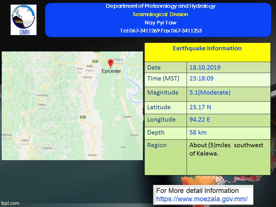 ယနေ့ မြန်မာစံတော်ချိန် ၂၃ နာရီ၊ ၁၈ မိနစ်၊ ဝ၉ စက္ကန့်တွင် ဟားခါးမြေငလျင်စခန်းမှ အရှေ့မြောက်ဘက် (၅၃)မိုင် ခန့်ကွာဝေးသော မြန်မာနိုင်ငံပြည်တွင်း (ကလေးဝမြို့၏ အနောက်တောင်ဘက် (၅)မိုင် ခန့်အကွာ)၊ မြောက်လတ္တီတွဒ် (၂၃.၁၇)ဒီဂရီ၊ အရှေ့လောင်ဂျီတွဒ် (၉၄.၂၂)ဒီဂရီ၊ အနက် (၅၈) ကီလိုမီတာကို ဗဟိုပြု၍ အင်အား ရစ်(ခ်)တာစကေး (၅ ဒသမ ၁) အဆင့်ရှိ အင်အားအသင့်အတင့်ရှိသော မြေငလျင်တစ်ခု လှုပ်ရှားသွားကြောင်း မိုးလေဝသနှင့် ဇလဗေဒညွှန်ကြားမှု ဦးစီးဌာန၏ ထုတ်ပြန်ချက်အရ သိရသည်။