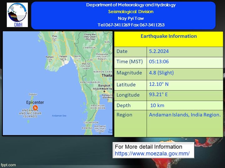 ၂၀၂၄ ခုနှစ်၊ ဖေဖော်ဝါရီ ၅ ရက်၊ မြန်မာစံတော်ချိန် (၀၅) နာရီ၊ (၁၃) မိနစ်တွင် ကမ္ဘာအေးမြေငလျင်စခန်းမှ အနောက်တောင်ဘက် (၃၈၀) မိုင်ခန့်ကွာဝေးသော မြန်မာနိုင်ငံပြည်ပ (Andaman Islands, India Region)၊ မြောက်လတ္တီတွဒ် (၁၂ ဒသမ ၁၀) ဒီဂရီ၊ အရှေ့လောင်ဂျီတွဒ် (၉၃ ဒသမ ၂၁) ဒီဂရီ၊ အနက် (၁၀) ကီလိုမီတာခန့်ကို ဗဟိုပြု၍ ငလျင်တစ်ခု လှုပ်ရှားသွားကြောင်း သိရသည်။