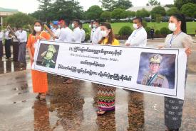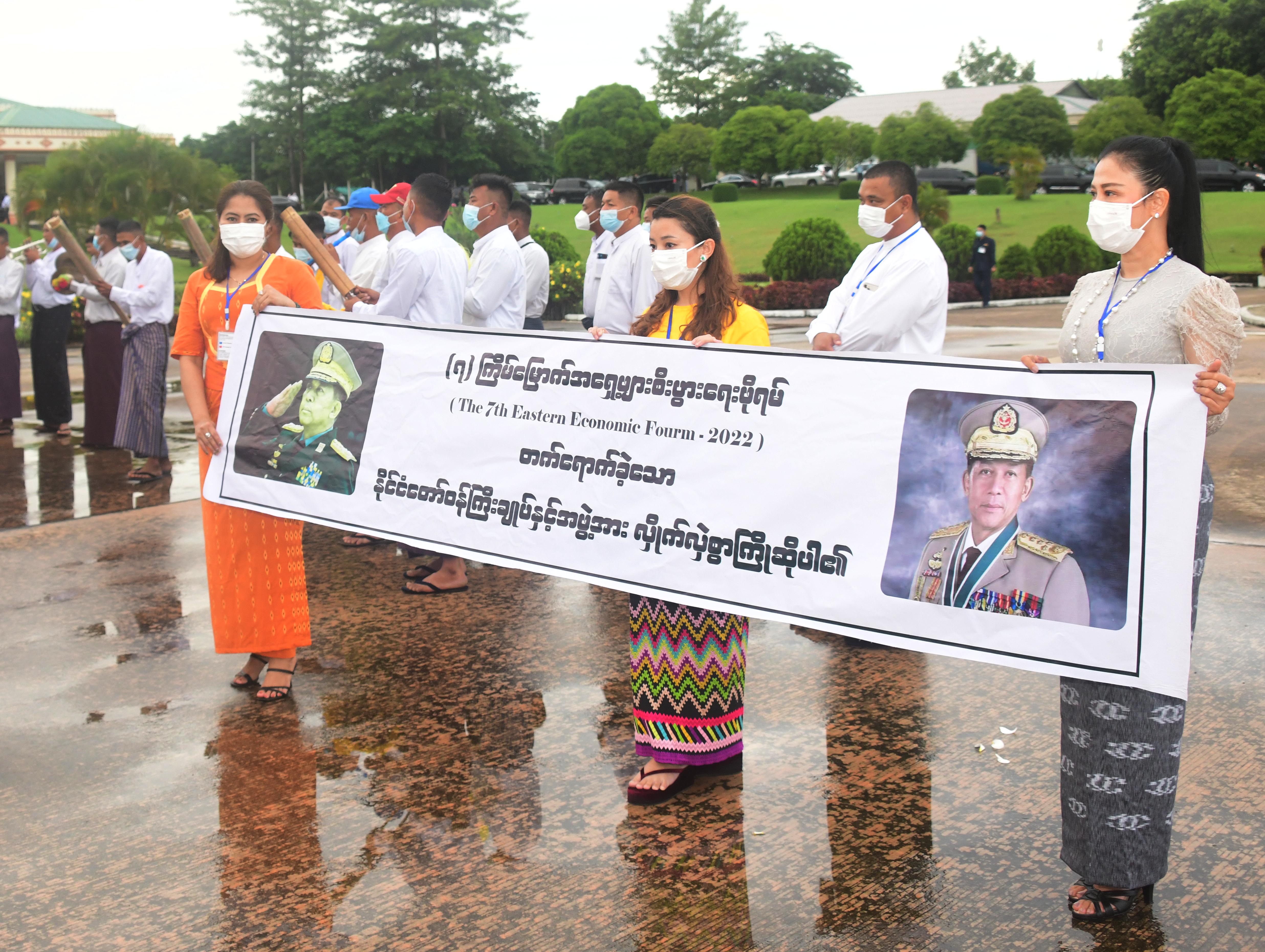 ထို့ပြင် နိုင်ငံတော်ဖွံ့ဖြိုးတိုးတက်ရေးကို တစိုက်မတ်မတ်ဦးတည်၍ ခရီးစဉ်အတွင်း နေ့မအား ညမနားဖြင့် နှစ်နိုင်ငံအကြား ချစ်ကြည်ရင်းနှီးမှု၊ စီးပွားရေး၊ ကျန်းမာရေး၊ ပညာရေးဆိုင်ရာတို့တွင် ပြည်သူအချင်းချင်း၊ လုပ်ငန်းရှင်များအချင်းချင်း ပူးပေါင်းဆောင်ရွက်နိုင်မည့် အခွင့်အလမ်းများ ပေါ်ပေါက်လာစေရေးအတွက် ကြိုးပမ်းအားထုတ် ဆောင်ရွက်ခဲ့ကြသည့် နိုင်ငံတော်စီမံအုပ်ချုပ်ရေးကောင်စီဥက္ကဋ္ဌ နိုင်ငံတော်ဝန်ကြီးချုပ် ဦးဆောင်သည့် မြန်မာအဆင့်မြင့် ကိုယ်စားလှယ်အဖွဲ့အား ဂုဏ်ပြုကြိုဆိုသောအားဖြင့် တိုင်းရင်းသား၊ တိုင်းရင်းသူ သားငယ်၊ သမီးငယ်လေးများ၊ ရိုးရာအက အလှအဖွဲ့များ၊ ဒေသခံပြည်သူများက လေဆိပ်တွင် အသင့်စောင့်ကြို၍ လေဆိပ်လေယာဉ်အဆင်းမှ VIP ဆောင်အထိလည်းကောင်း၊ တပ်မတော်လေဆိပ်မှ အဝိုင်းနေရာထိအလည်းကောင်း၊ တပ်မတော်လေဆိပ် အဝိုင်းနေရာမှ အပြည်ပြည် ဆိုင်ရာ လေဆိပ်အဝိုင်းနေရာအထိလည်းကောင်း “(၇)ကြိမ်မြောက် အရှေ့ဖျား စီးပွားရေးဖိုရမ် (The 7th Eastern Economic Forum-2022) တက်ရောက်ခဲ့သော နိုင်ငံတော်ဝန်ကြီးချုပ်နှင့်အဖွဲ့အား လှိုက်လှဲစွာကြိုဆိုပါ၏” “ကမ္ဘာ့အလယ် မြန်မာ့ ဂုဏ်ဝင့်ထည်စေသော နိုင်ငံတော်ဝန်ကြီးချုပ် ဗိုလ်ချုပ်မှူးကြီး မင်းအောင်လှိုင်အား အထူးပင် ကျေးဇူးတင်ပါသည်” “အမိမြန်မာနိုင်ငံတော်အတွက် ဗိုလ်ချုပ်မှူးကြီး မင်းအောင်လှိုင်၏ ကြိုးစားမှုများအား လှိုက်လှဲစွာ ဂုဏ်ယူဝမ်းမြောက်ပါသည်” “နိုင်ငံတော်စီမံ အုပ်ချုပ်ရေးကောင်စီအစိုးရ အောင်မြင်ပါစေ” “ဂုဏ်ယူဝမ်းမြောက် စွာဖြင့် ကြိုဆိုပါသည်။” “ရုရှား-မြန်မာ ချစ်ကြည်ရေး ထာဝရ အဓွန့်ရှည်တည်မြဲပါစေ” ဟူသော စာတန်းများပါရှိသည့် ဗွီနိုင်းများ၊ နိုင်ငံတော် စီမံအုပ်ချုပ်ရေးကောင်စီဥက္ကဋ္ဌ နိုင်ငံတော်ဝန်ကြီးချုပ် ၏ ရုရှားဖက်ဒရေးရှင်းနိုင်ငံခရီးစဉ် လှုပ်ရှားမှု ပုံရိပ်များပါရှိသည့် အလျား ၅ ပေ၊ အနံ ၂ ပေခန့်ရှိ ရုပ်ပုံကားချပ် ၃၀ ခန့်နှင့် ပြည်ထောင်စုသမ္မတ မြန်မာနိုင်ငံတော်အလံများကို ကိုင်ဆောင်၍ အလံများဝှေ့ယမ်းကာ နိုင်ငံတော် စီမံအုပ်ချုပ်ရေး ကောင်စီဥက္ကဋ္ဌ နိုင်ငံတော်ဝန်ကြီးချုပ် ဗိုလ်ချုပ်မှူးကြီး မင်းအောင်လှိုင် ကျန်းမာပါစေ၊ ချမ်းသာပါစေ ဟု ကြွေးကြော်လျက် သောင်းသောင်းဖြဖြ ကြိုဆို ဂုဏ်ပြုနှုတ်ဆက်ခဲ့ကြကြောင်း သတင်းရရှိသည်။