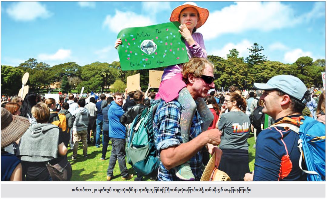 ပစိဖိတ်နဲ့ သြစတြေးလျကျောင်းသားတွေဟာ စက်တင်ဘာ ၂၀ ရက်က ဆွီဒင်သဘာဝပတ်ဝန်းကျင်ဆိုင်ရာ လူငယ်အမျိုးသမီးတက်ကြွလှုပ်ရှားသူ ဂရီတာသွန်ဘာ့ချ်ရဲ့ ဦးဆောင်မှုနဲ့ ကမ္ဘာလုံးဆိုင်ရာ ရာသီဥတု သပိတ်မှောက်ပွဲဆင်နွှဲခဲ့ပြီး ကမ္ဘာကြီးပူနွေးလာမှုကို လျှော့ချပေးဖို့ တောင်းဆိုလိုက်တဲ့သတင်းတစ်ပုဒ်ကို ဖတ်ရှုလိုက်ရပါတယ်။ ယနေ့ခေတ်မှာ ကမ္ဘာကြီးပူနွေးလာမှုဟာ ကျယ်ကျယ်လောင်လောင်ကြားနေရတဲ့ ကိစ္စရပ်တစ်ခုဖြစ်လာသလို နိုင်ငံတိုင်းကလည်း အလေးပေးလာတဲ့ ကိစ္စရပ်တစ်ခုလို့ဆိုရင်လည်း မှန်မယ်ထင်ပါတယ်။