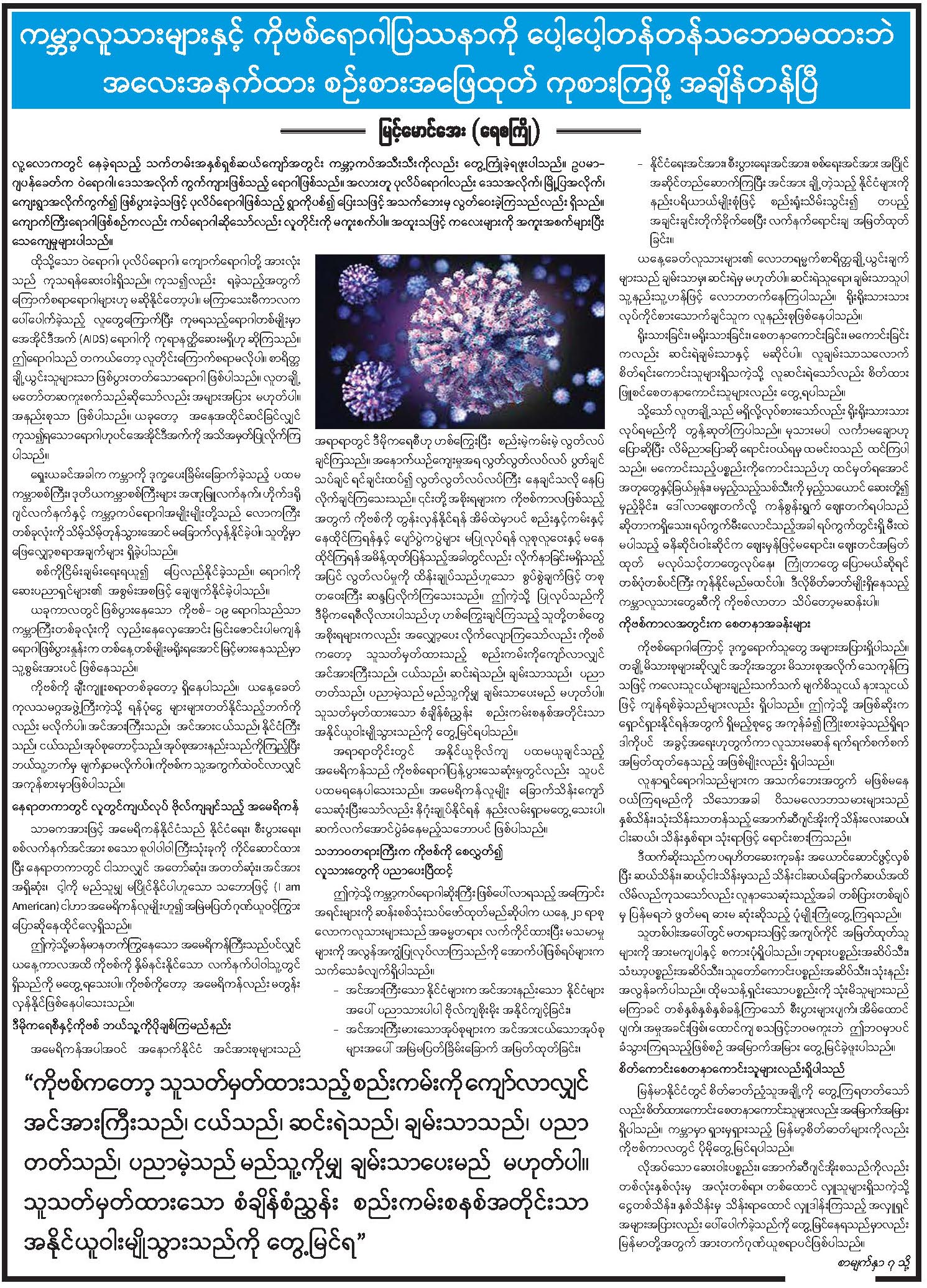 ကမ္ဘာ့လူသားများနှင့် ကိုဗစ်ရောဂါပြဿနာကို ပေါ့ပေါ့တန်တန်သဘောမထားဘဲ အလေးအနက်ထား စဉ်းစားအဖြေထုတ် ကုစားကြဖို့ အချိန်တန်ပြီ