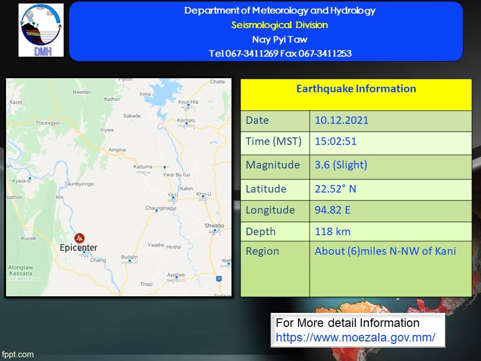 ၂၀၂၁ ခုနှစ်၊ ဒီဇင်ဘာလ (၁၀)ရက်နေ့၊ မြန်မာစံတော်ချိန် (၁၅)နာရီ၊ (၀၂)မိနစ်၊ (၅၁)စက္ကန့် အချိန်တွင် ကန့်ဘလူမြေငလျင်စခန်းမှ အနောက်တောင်ဘက် (၆၅)မိုင်ခန့်ကွာဝေးသော မြန်မာနိုင်ငံ ပြည်တွင်း (ကနီမြို့၏ မြောက်-အနောက်မြောက်ဘက် (၆)မိုင်ခန့်အကွာ)၊ မြောက်လတ္တီတွဒ် (၂၂.၅၂) ဒီဂရီ၊ အရှေ့လောင်ဂျီတွဒ် (၉၄.၈၂)ဒီဂရီ၊ အနက် (၁၁၈)ကီလိုမီတာကို ဗဟိုပြု၍ အင်အားရစ်(ခ်)တာစကေး (၃.၆)အဆင့်ရှိ အင်အားအနည်းငယ်ရှိသော မြေငလျင်တစ်ခု လှုပ်ရှားသွားကြောင်း တိုင်းထွာရရှိပါသည်။