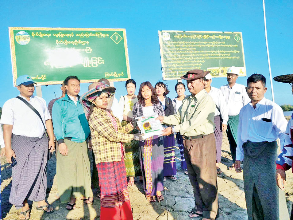 ဦးစွာ မြို့နယ်စိုက်တိုးမြှင့်အဖွဲ့ဥက္ကဋ္ဌ ဦးဝင်းလှိုင်နှင့် မြို့နယ်စိုက်တိုးမြှင့်အဖွဲ့ဝင်တို့က ရွာသစ်ရပ်ကွက်ရှိ နေကြာစိုက်တောင်သူများအား နေကြာမျိုးစေ့များ ပေးအပ်ပြီး တောင်သူ ဦးအောင်သူ၏ မြေနုကျွန်းကိုင်းမြေ တစ်ဧကတွင် Supersun 41 နေကြာမျိုးစေ့များကို စိုက်ပျိုးပေးကြကာ တောင်သူများ နေကြာစိုက်ပျိုးနေမှုကို ကြည့်ရှုအားပေးသည်။