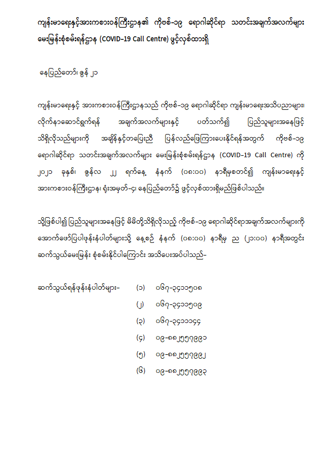 ကျန်းမာရေးနှင့်အားကစားဝန်ကြီးဌာန၏ ကိုဗစ်-၁၉ ရောဂါဆိုင်ရာ သတင်းအချက်အလက်များ မေးမြန်းစုံစမ်းရန်ဌာန (COVID-19 Call Centre) ဖွင့်လှစ်ထားရှိ