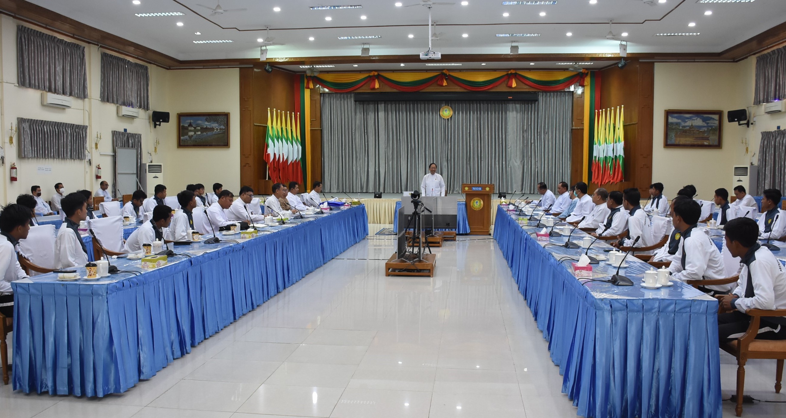 ဆက်လက်၍ ဒုတိယဝန်ကြီးက ဆေးနှင့် ဆေးပညာနှီးနွယ် တက္ကသိုလ်များတွင် ဘောလုံး၊ ရေကူး၊ ဘတ်စကက်ဘော၊ ကြက်တောင် စသည့်အားကစားနည်းများ ဆောင်ရွက်နိုင်မည့် အခြေအနေများနှင့် တက္ကသိုလ်များအကြား ဘောလုံးပြိုင်ပွဲများ ပိုမိုဆောင် ရွက်နိုင်မည့် အခြေအနေများကို ရှင်းလင်းတင်ပြီး ကျန်းမာရေးဝန်ကြီးဌာနကိုယ်စားပြု တက္ကသိုလ်ဘောလုံးအသင်းမှ အသင်းအုပ်ချုပ်သူ၊ အသင်းနည်းပြနှင့် ဘောလုံးအားကစား သမားများက တစ်ဦးချင်း မိတ်ဆက်ကြသည်။