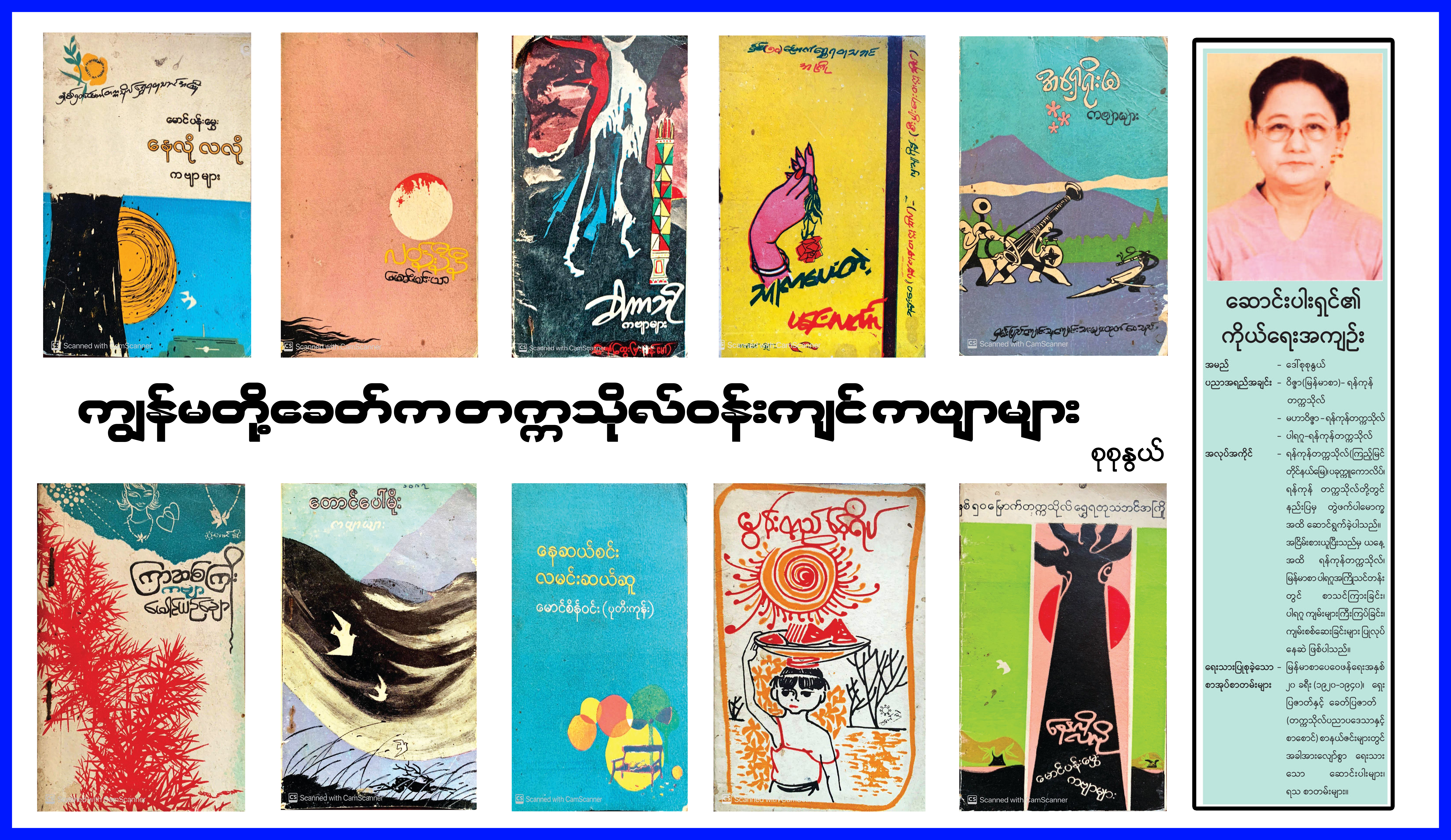 ပုံစံအားဖြင့် မောင်ပန်းမွှေး၏ “နေလိုလလို”၊ မောင်ယဉ်ချော၏ “ကြာဆစ်ကြိုး” စသည်တို့ကဲ့သို့ တစ်ဦးချင်း ထုတ်သည့် ကဗျာစာအုပ်များ “နွေဦးအဖွင့်”၊ “မွန်းတည့်နေရိပ်” တို့ကဲ့သို့ ဝါသနာတူများ စုထုတ်သည့် ကဗျာ စာအုပ်များ၊ “မြက်ခင်းစိမ်း” ၊ “မြရွက်လှေ” တို့ကဲ့သို့ အတန်းသူများစုထုတ်သည့် ကဗျာစာအုပ်များ “မြဝါးရုံ”၊ “ငွေကြယ်ကျွန်း” စသည့် အသင်းလိုက်ထုတ်သည့် ကဗျာစာအုပ်များ၊ “အရှေ့ရိုးမ”၊ “ရိုးလှသန္တာ” တို့ကဲ့သို့ လူမျိုးစုအလိုက် စုထုတ်သည့် ကဗျာစာအုပ်များ၊ တက္ကသိုလ် နှစ် ၅၀ အကြိုအဖြစ်ထုတ်သည့် “သူကပေးတဲ့ ပန်းလင်္ကာ”၊ “ကံ့ကော်လေသင်း” တို့ကဲ့သို့ အခြေအနေတစ်ခုကို အကြောင်းပြုထုတ်သည့် ကဗျာစာအုပ်များကို တွေ့နိုင်ပါ သည်။