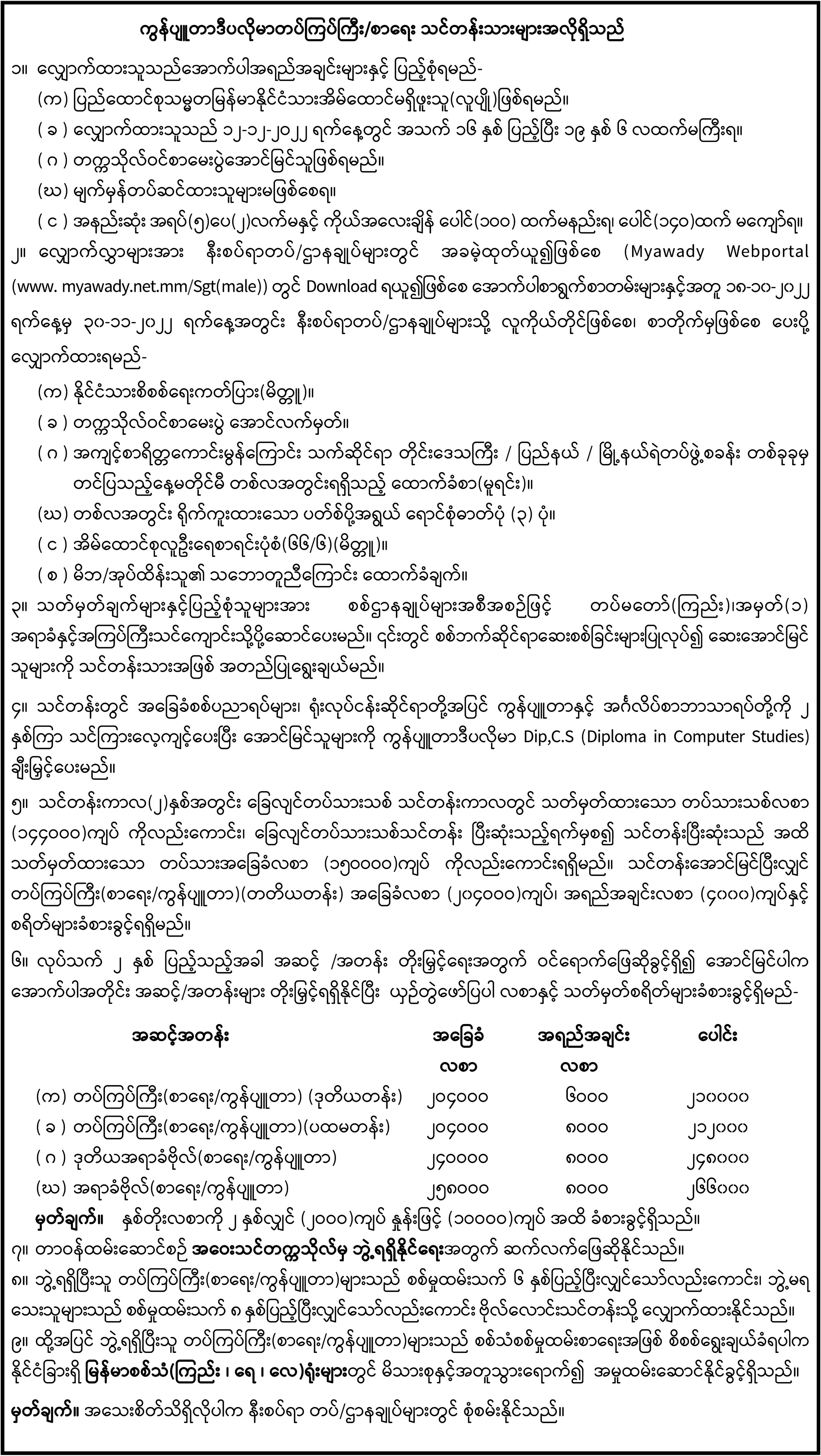 ကွန်ပျူတာ ဒီပလိုမာ တပ်ကြပ်ကြီး/ စာရေး သင်တန်းသားများ အလိုရှိသည်