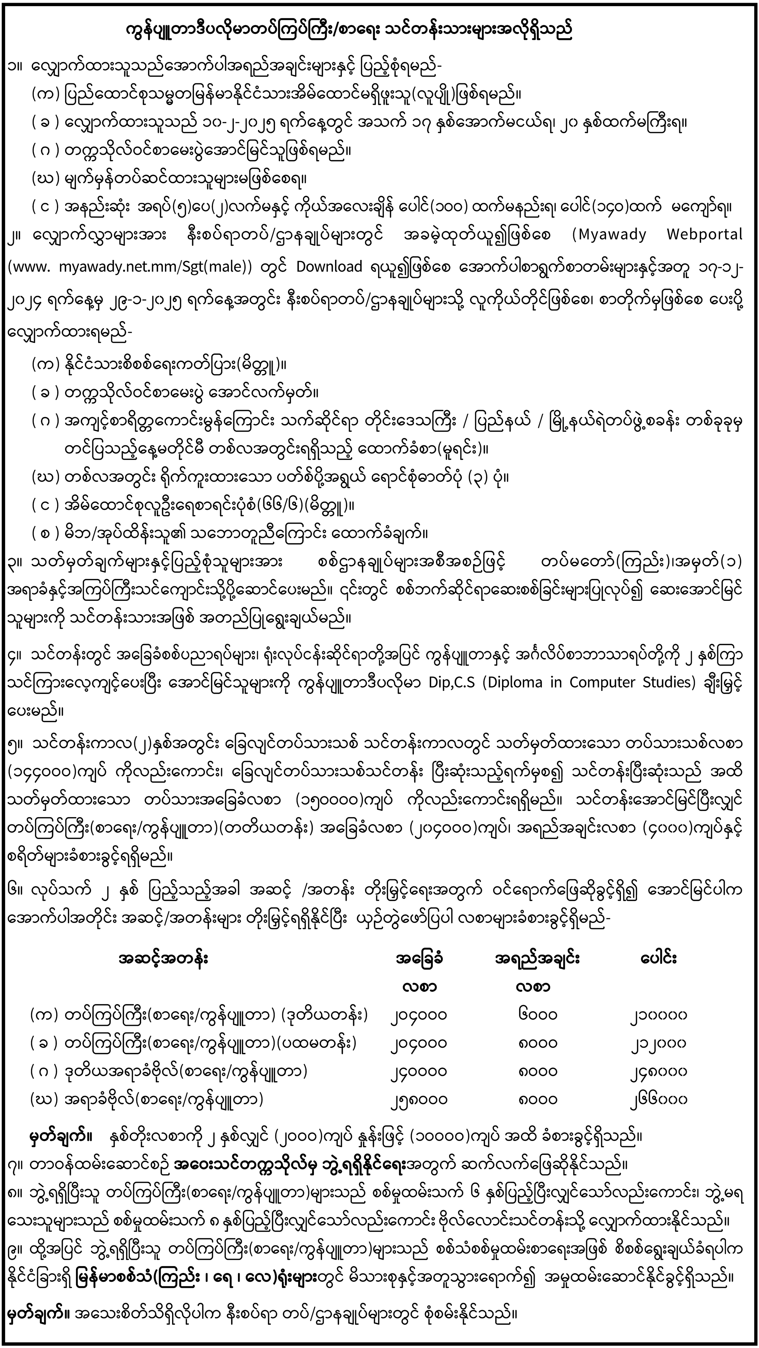 ကွန်ပျူတာ ဒီပလိုမာ တပ်ကြပ်ကြီး/ စာရေး သင်တန်းသားများအလိုရှိသည်