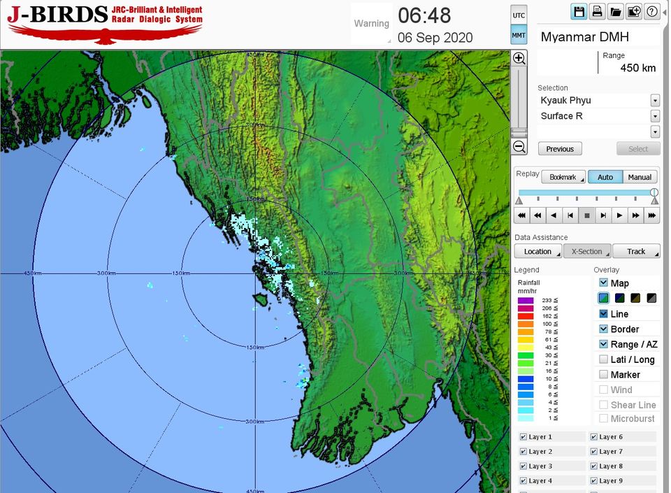 မိုးလေဝသနှင့်ဇလဗေဒညွှန်ကြားမှုဦးစီးဌာနမှ စက်တင်ဘာလ ၆ ရက်နေ့ နံနက် ၇ နာရီအချိန်တွင် နေ့စဉ်မိုးလေဝသသတင်း ထုတ်ပြန်ရာ ဘင်္ဂလားပင်လယ်အော်အခြေအနေမှာ ကပ္ပလီပင်လယ်ပြင်နှင့် ဘင်္ဂလားပင်လယ်အော်တို့တွင် မုတ်သုံလေ အားနည်းနေပါသည်။
