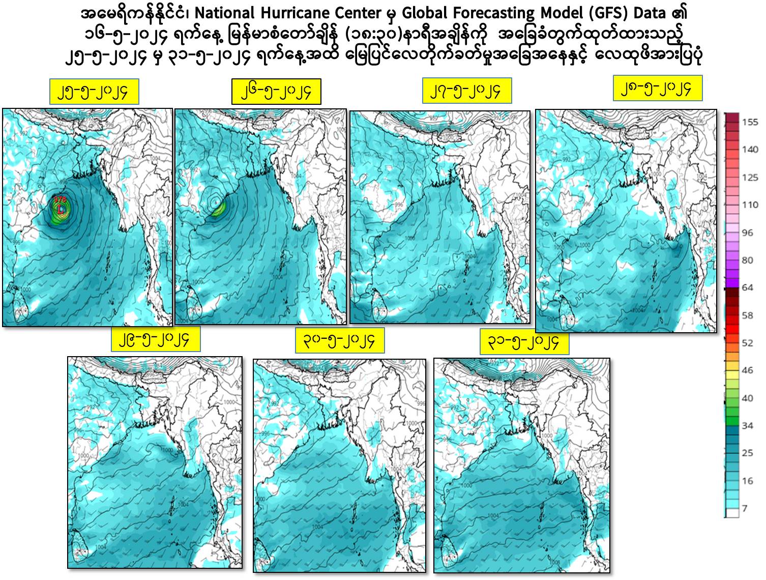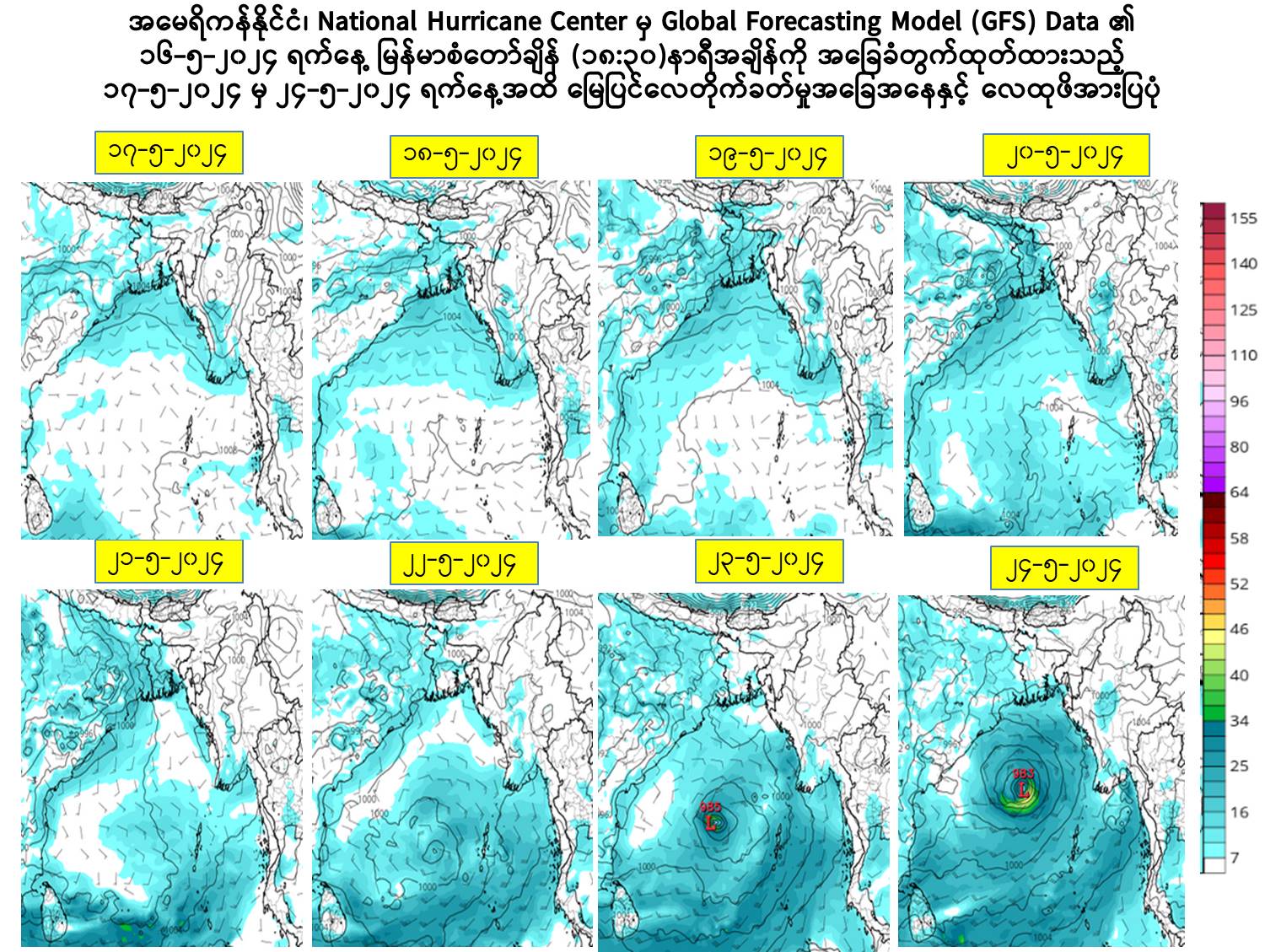 အမေရိကန်နိုင်ငံ၊ National Hurricane Center မှ Global Forecasting Model (GFS) Data ၏   ၁၆-၅-၂၀၂၄ ရက်နေ့ မြန်မာစံတော်ချိန် (၁၈:၃၀) နာရီအချိန်ကို အခြေခံတွက်ထုတ်ထားသည့် ခန့်မှန်းချက်များအရ ၂၃-၅-၂၀၂၄ ရက်နေ့ခန့်တွင် ဘင်္ဂလားပင်လယ်အော်အရှေ့တောင်ပိုင်းနှင့် ယင်းနှင့်ဆက်စပ်လျက်ရှိသော ဘင်္ဂလားပင်လယ်အော် အရှေ့အလယ်ပိုင်းတို့တွင် လေဖိအားနည်းရပ်ဝန်း စတင်ဖြစ်ပေါ်လာနိုင်ပြီး၊ ပိုမိုအားကောင်းလာနိုင်ကာ မြောက် - အနောက်မြောက်ဘက်သို့ ရွေ့လျားနိုင်ပြီး၊ ၂၆-၅-၂၀၂၄ ရက်နေ့ခန့်တွင် အိန္ဒိယနိုင်ငံနှင့် ဘင်္ဂလားဒေ့ရှ်ကမ်းရိုးတန်းတို့ အကြားသို့ ဦးတည်ရွေ့လျားနိုင်သည်ကို တွေ့ရှိရပါသည်။