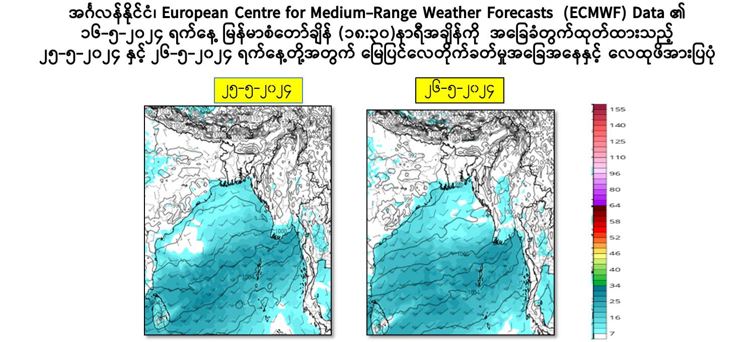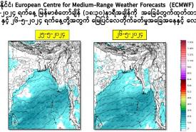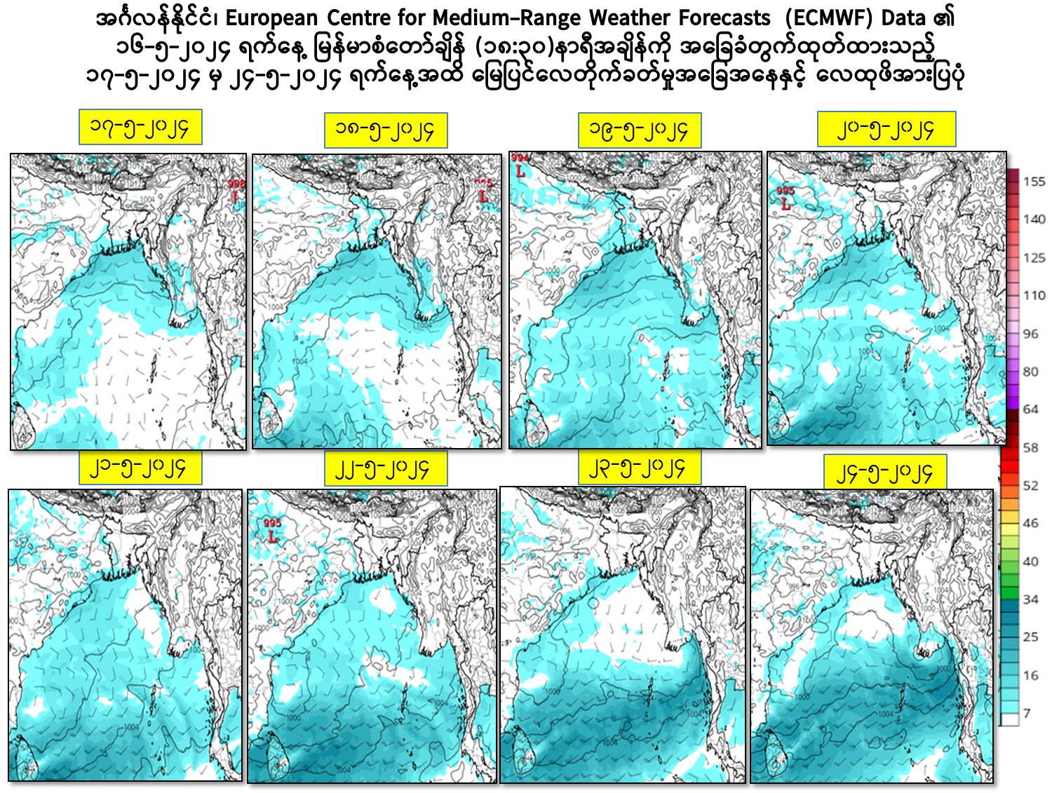 အင်္ဂလန်နိုင်ငံ၊ European Centre for Medium-Range Weather Forecasts (ECMWF) Data ၏ ၁၆-၅-၂၀၂၄ ရက်နေ့ မြန်မာစံတော်ချိန် (၁၈:၃၀) နာရီအချိန်ကို အခြေခံတွက်ထုတ်ထားသည့် ခန့်မှန်းချက်များအရ ၂၃-၅-၂၀၂၄ ရက်နေ့ခန့်တွင် ကပ္ပလီပင်လယ်ပြင်၌ လေဖိအားနည်းဆဲလ်အဖြစ် စတင်ဖြစ်ပေါ်လာနိုင်ပြီး၊ မြောက်ဘက်သို့ ရွေ့လျားနိုင်ကာ၊               ၂၅-၅-၂၀၂၄ ရက်နေ့ခန့်တွင် မြန်မာနိုင်ငံ၊ မြစ်ဝကျွန်းပေါ်ဒေသသို့ ဦးတည်ရွေ့လျားနိုင်သည်ကို တွေ့ ရှိရပါသည်။