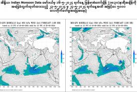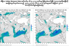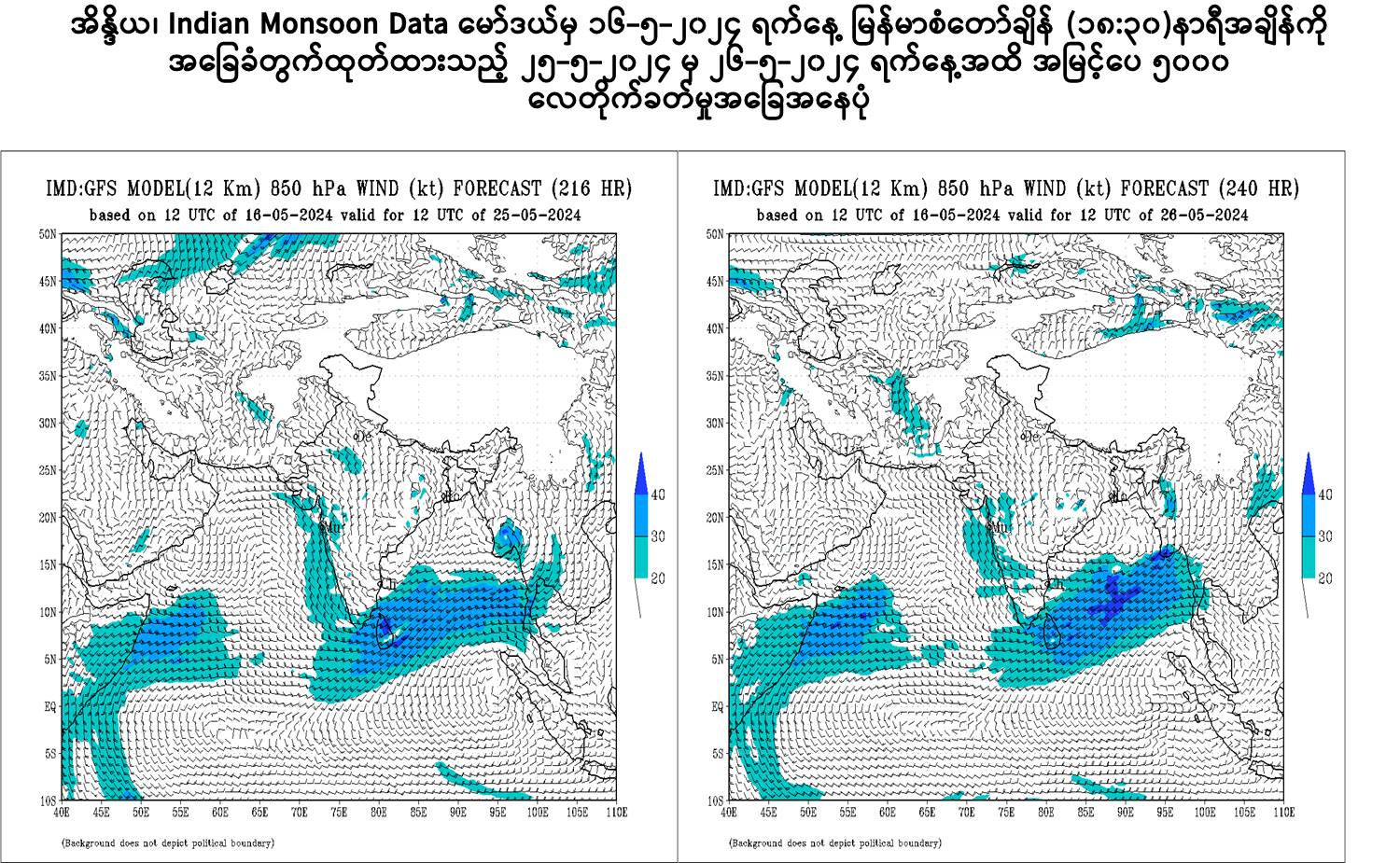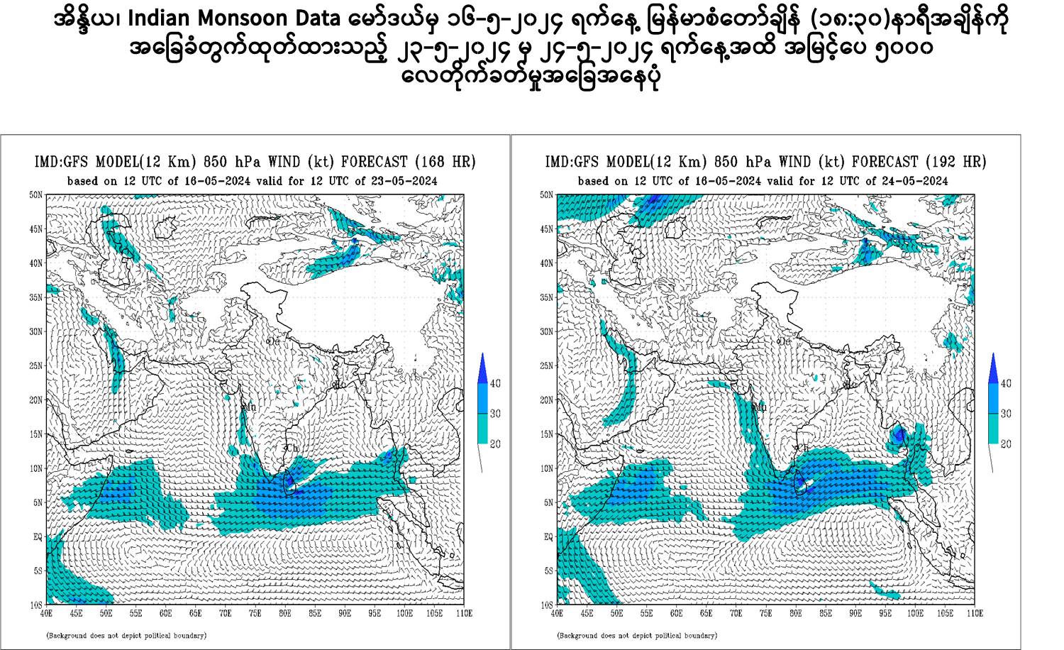 အိန္ဒိယနိုင်ငံ၊ Indian Monsoon Data မော်ဒယ်မှ ၁၆-၅-၂၀၂၄ ရက်နေ့ မြန်မာစံတော်ချိန် (၁၈:၃၀) နာရီအချိန်ကို အခြေခံတွက်ထုတ်ထားသည့် ခန့်မှန်းချက်များအရ ၂၃-၅-၂၀၂၄ ရက် နေ့ခန့်တွင် ကပ္ပလီပင်လယ်ပြင်မြောက်ပိုင်း၌ လေဖိအားနည်းရပ်ဝန်းအဖြစ် စတင်ဖြစ်ပေါ်လာနိုင်ပြီး၊ မြောက်ဘက်သို့ ရွေ့လျားနိုင်ကာ၊ ၂၅-၅-၂၀၂၄ ရက်နေ့ခန့်တွင် မြန်မာနိုင်ငံ၊ မြစ်ဝကျွန်းပေါ် ဒေသသို့ ဦးတည်ရွေ့လျားနိုင်သည်ကို တွေ့ရှိရပါသည်။