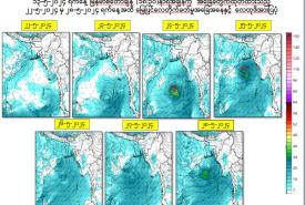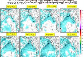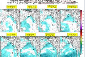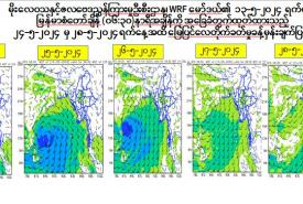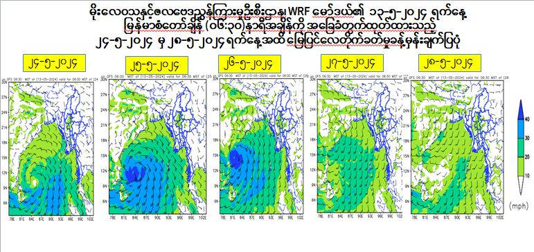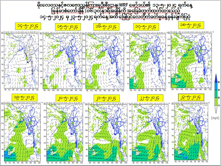 DMH-WRF Model ၏ ၁၃-၅-၂၀၂၄ ရက်နေ့ မြန်မာစံတော်ချိန် (၀၆:၃၀) နာရီအချိန်ကို အခြေခံတွက်ထုတ်ထားသည့် ခန့်မှန်းချက်များအရ ၂၂-၅-၂၀၂၄ ရက်နေ့ခန့်တွင် ဘင်္ဂလားပင်လယ်အော်အနောက်တောင်ပိုင်းနှင့် ယင်းနှင့်ဆက်စပ်လျက်ရှိသော ဘင်္ဂလားပင်လယ်အော် အနောက်အလယ်ပိုင်းတို့တွင် လေထုမငြိမ်မသက်မှုအခြေအနေ စတင်ဖြစ်ပေါ်နိုင်ပြီး၊ ၂၃-၅-၂၀၂၄ ရက်နေ့ခန့်တွင် လေဖိအားနည်းရပ်ဝန်း စတင်ဖြစ်ပေါ်လာနိုင်ပါသည်။ ၂၅-၅-၂၀၂၄ ရက်နေ့ခန့်တွင် အဆိုလေဖိအားနည်းရပ်ဝန်းသည် အနောက်-အနောက်မြောက်ဘက်သို့ ရွေ့လျားပြီး၊ ပိုမိုအားကောင်းလာနိုင်ကာ၊ ၂၇-၅-၂၀၂၄ ရက်နေ့ခန့်တွင် အိန္ဒိယနိုင်ငံ ကမ်းရိုးတန်းသို့ ဦးတည်ရွေ့လျားနိုင်သည်ကို တွေ့ရှိရပါသည်။